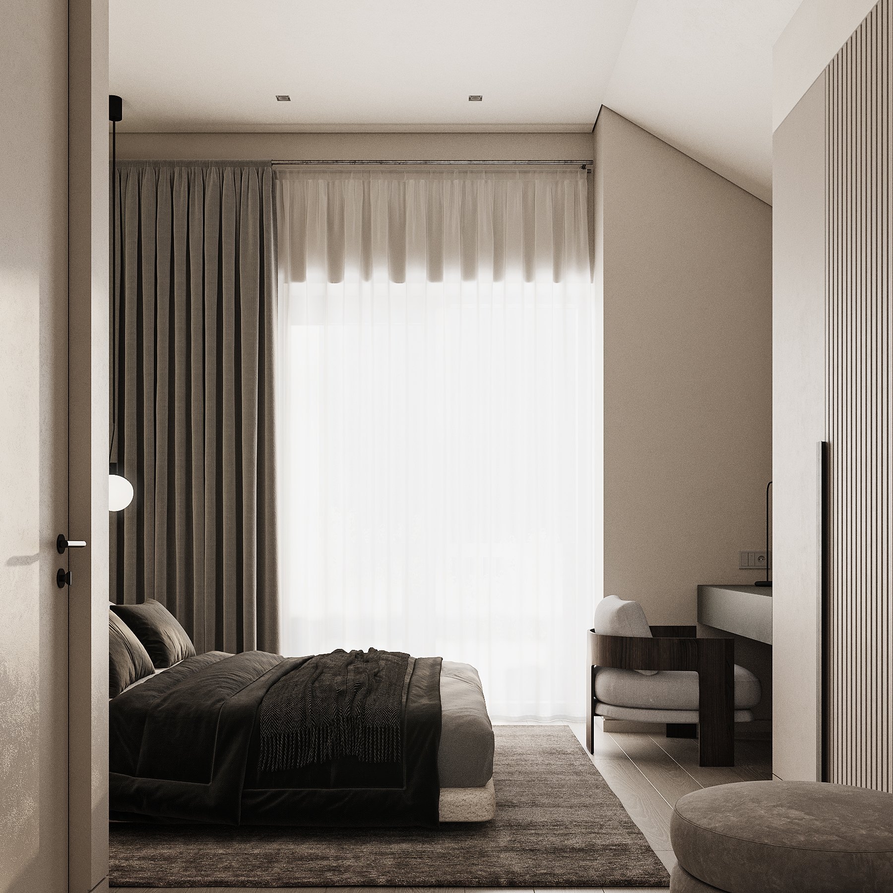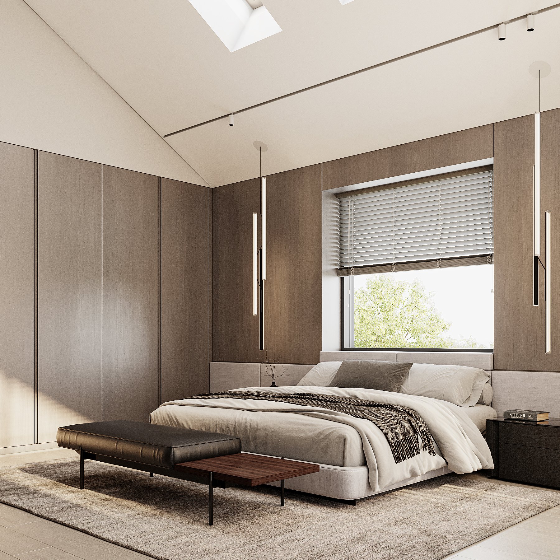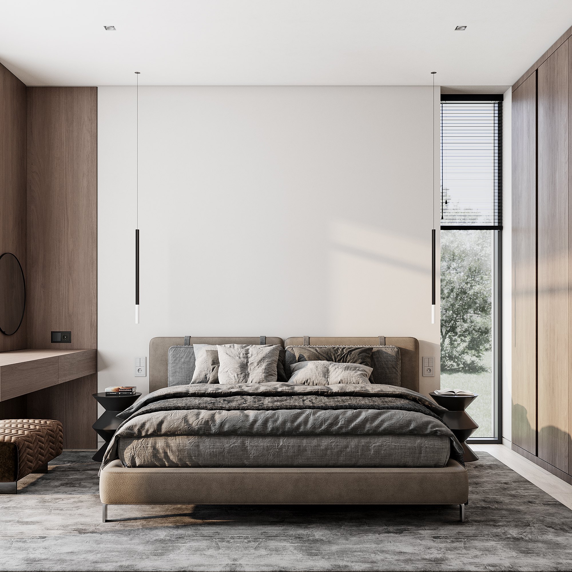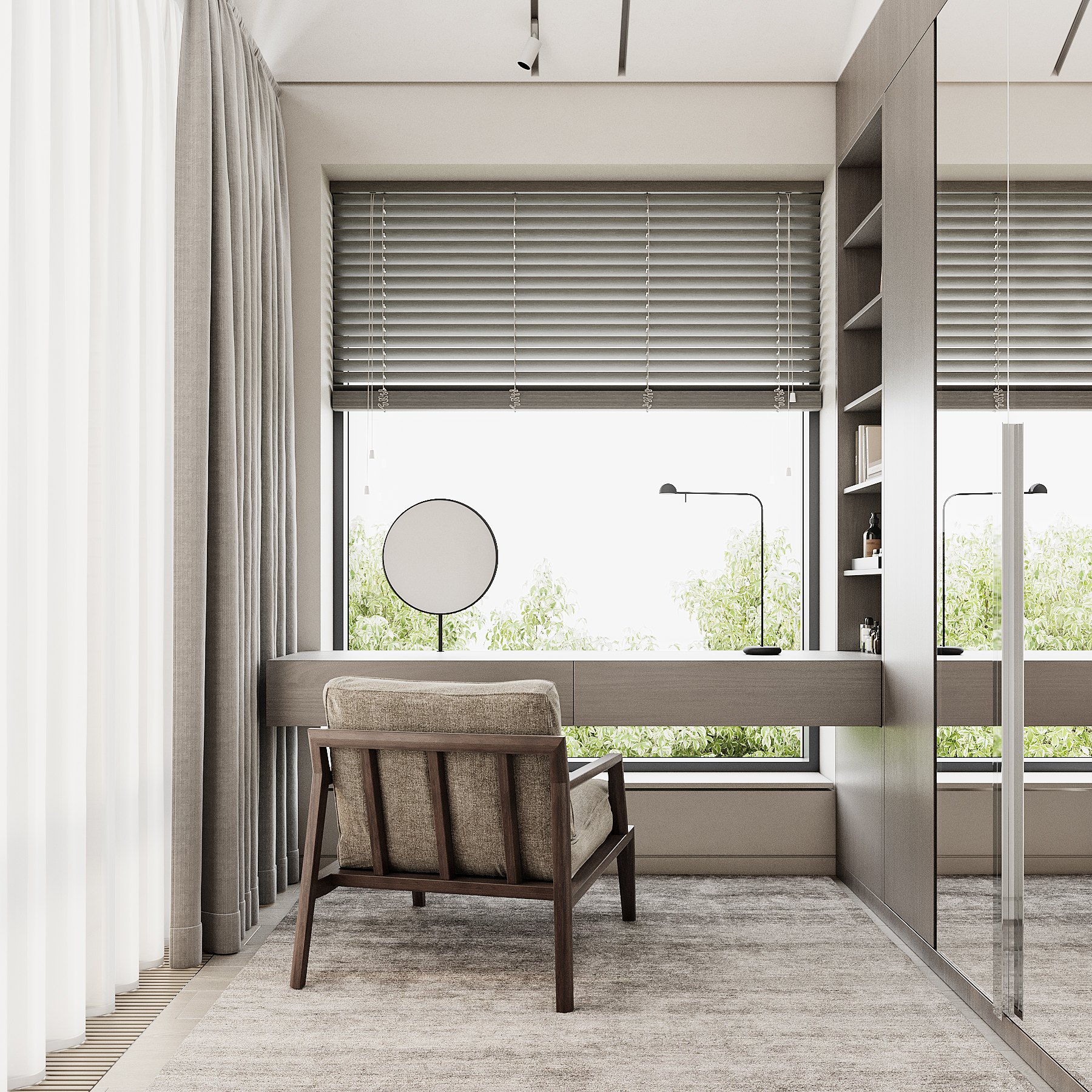 Стены оттенка Half Mushroom, шпон светлых тонов, высокий потолок и два окна наполняют спальню хозяев воздухом и светом. Предусмотрено отдельное помещение для гардероба и места для макияжа, оборудованного лаконичным столиком выполненном по эскизам дизайнера.