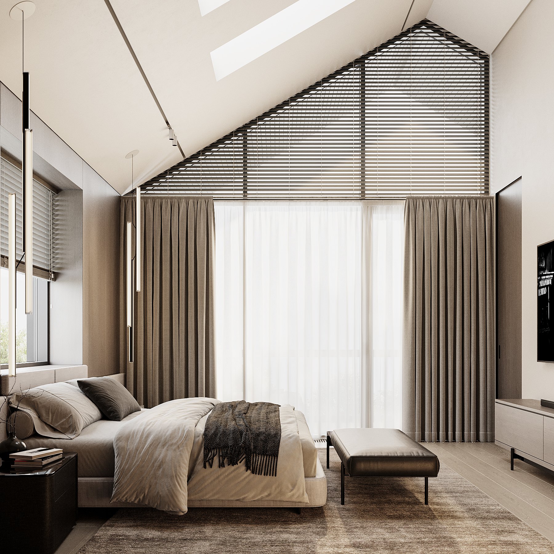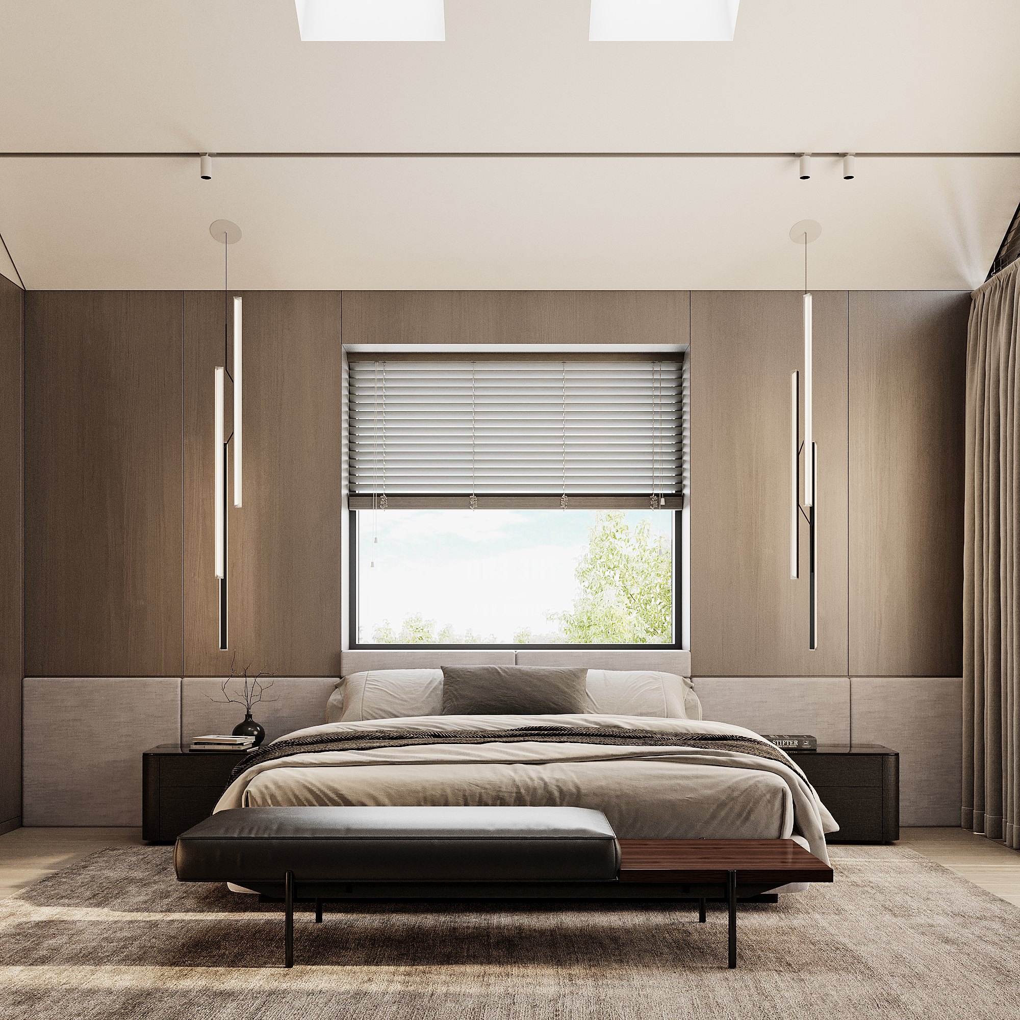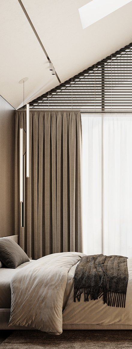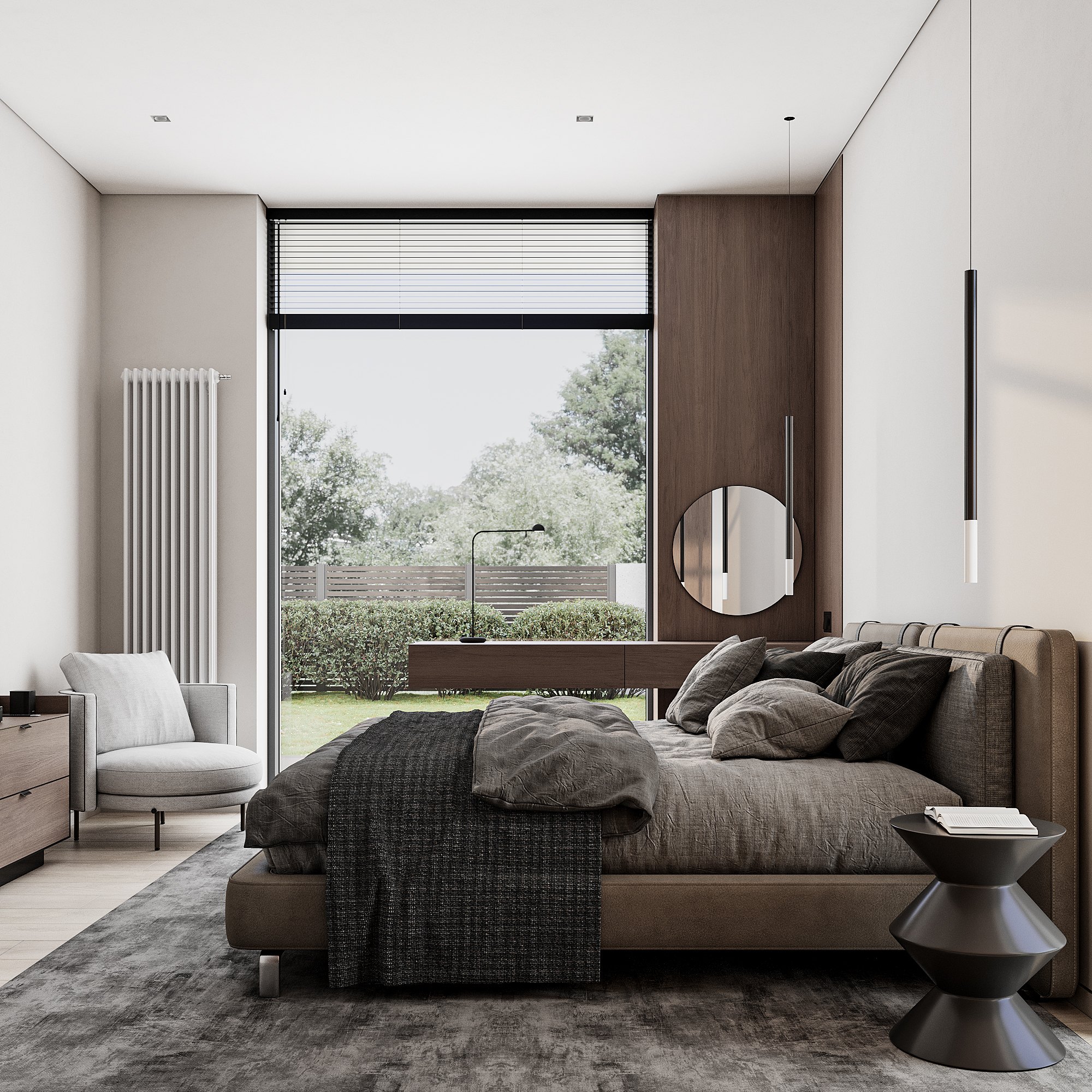 Стены оттенка Half Mushroom, шпон светлых тонов, высокий потолок и два окна наполняют спальню хозяев воздухом и светом. Предусмотрено отдельное помещение для гардероба и места для макияжа, оборудованного лаконичным столиком выполненном по эскизам дизайнера.