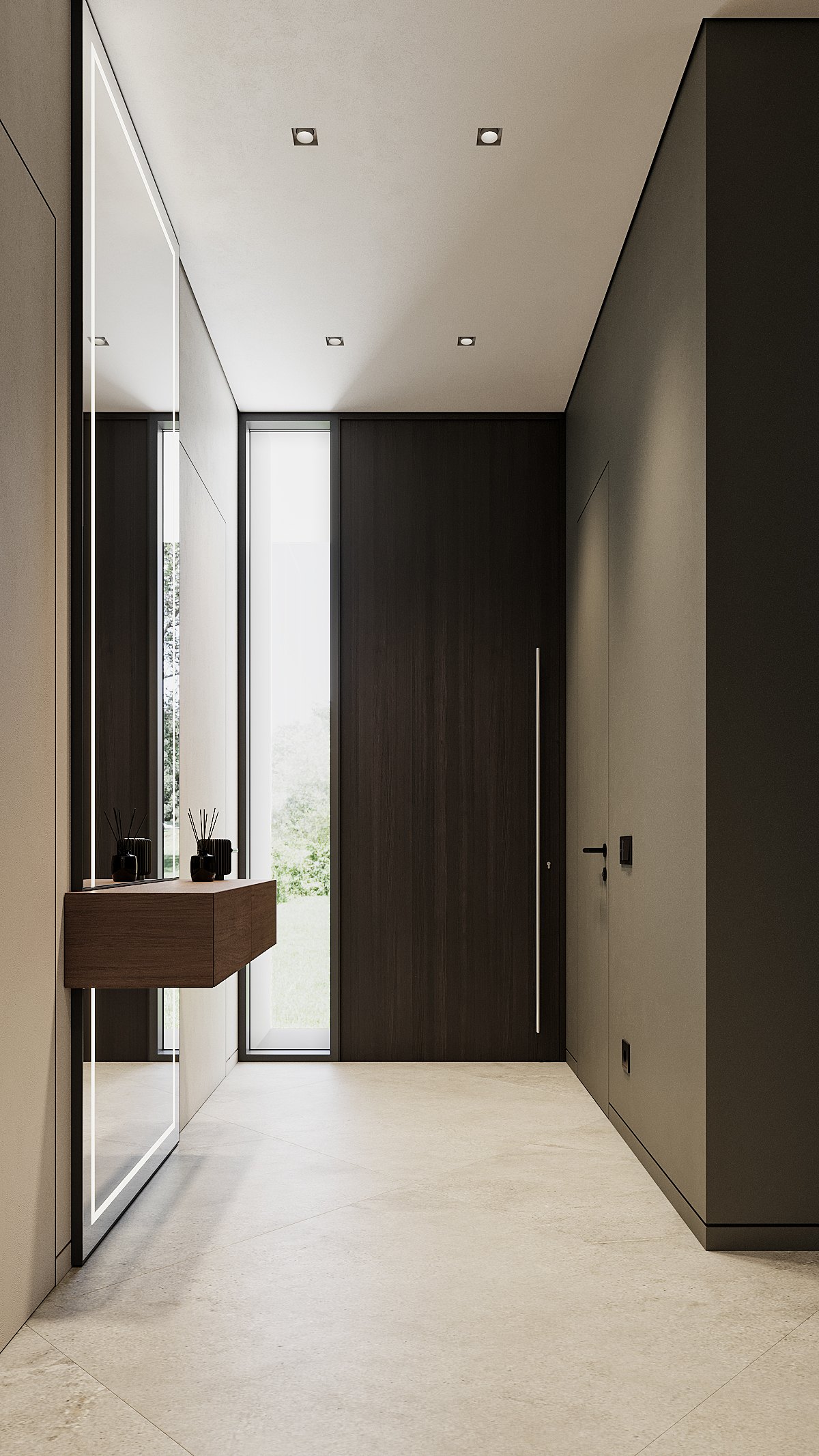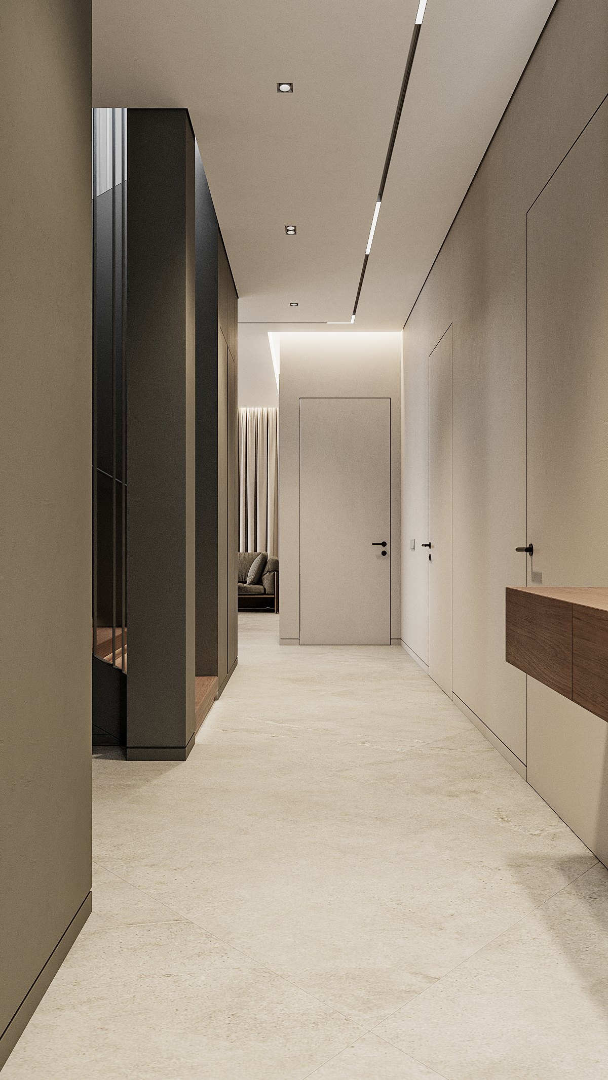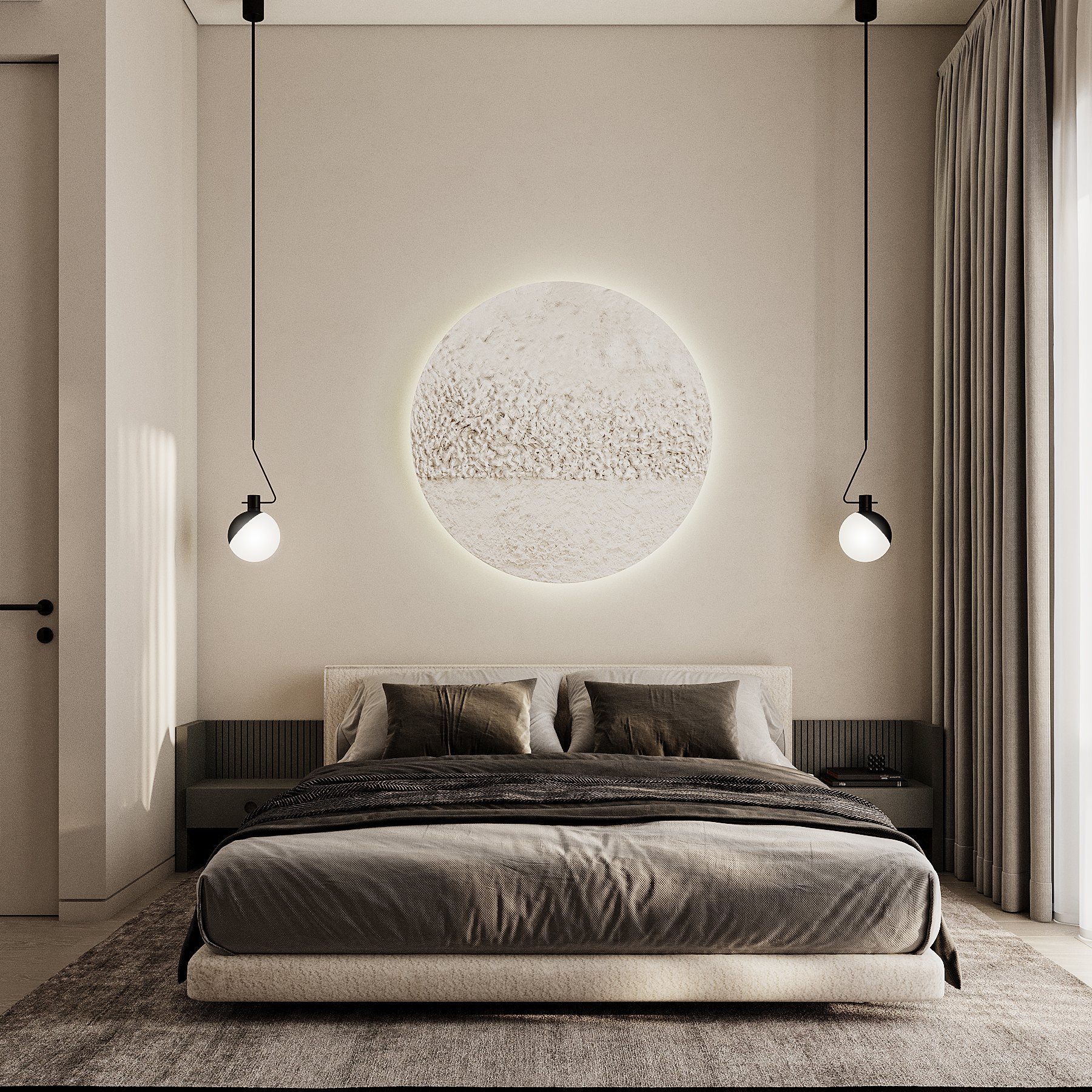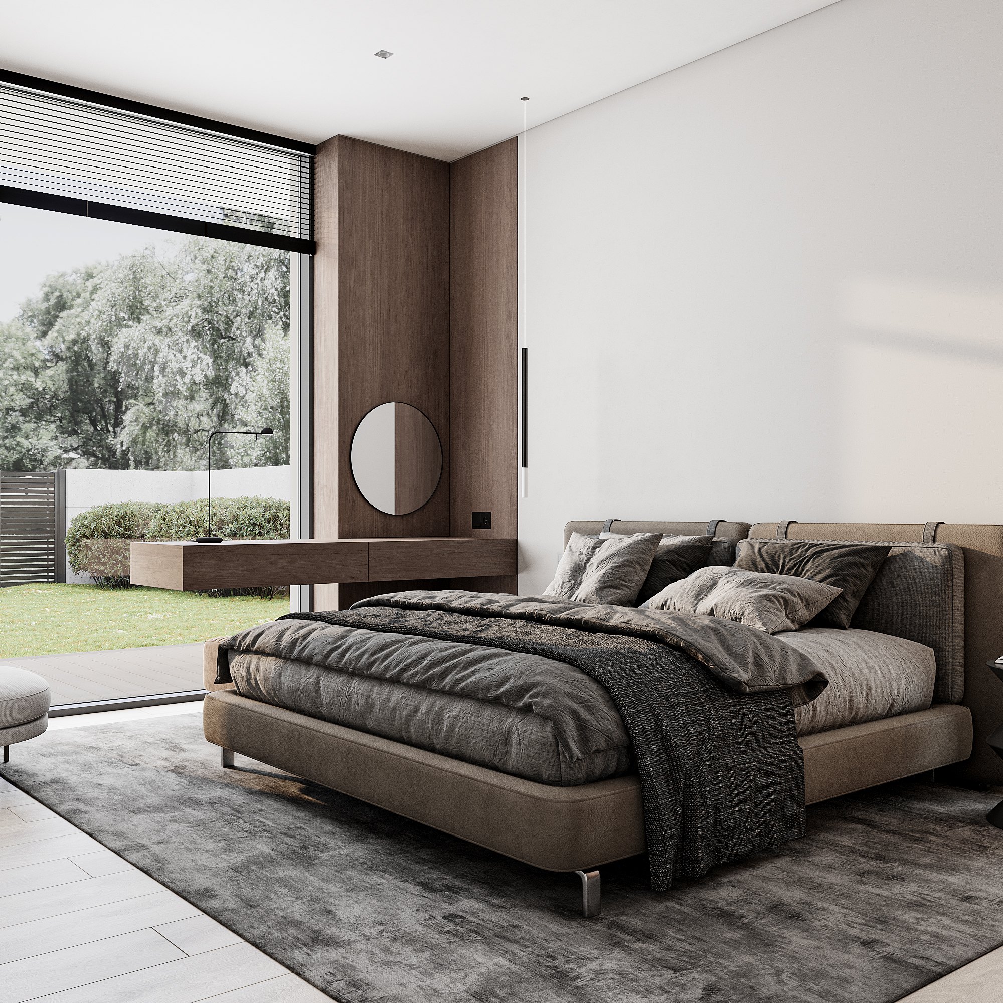 Стены оттенка Half Mushroom, шпон светлых тонов, высокий потолок и два окна наполняют спальню хозяев воздухом и светом. Предусмотрено отдельное помещение для гардероба и места для макияжа, оборудованного лаконичным столиком выполненном по эскизам дизайнера.