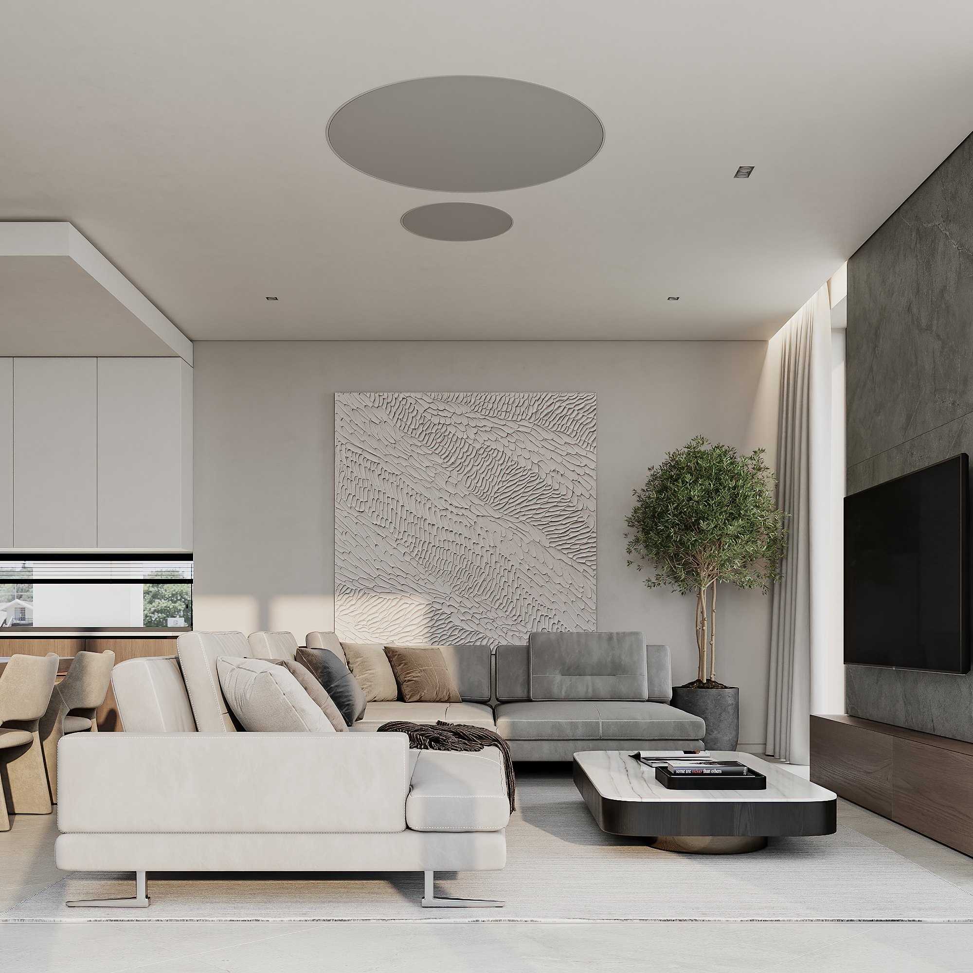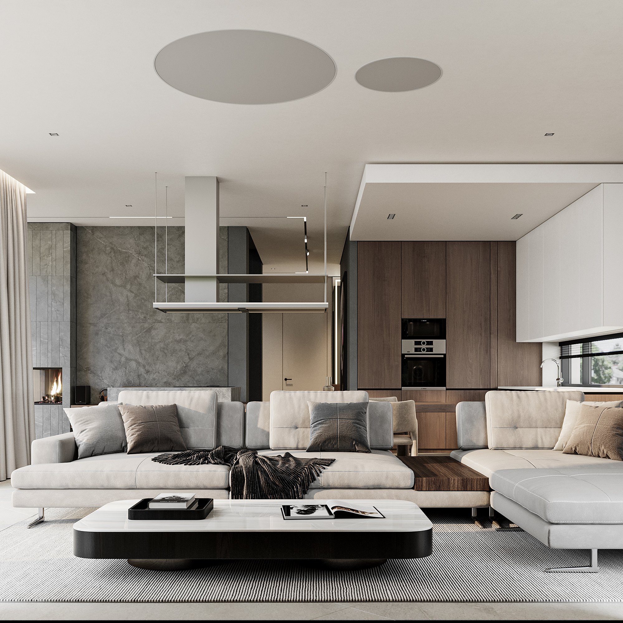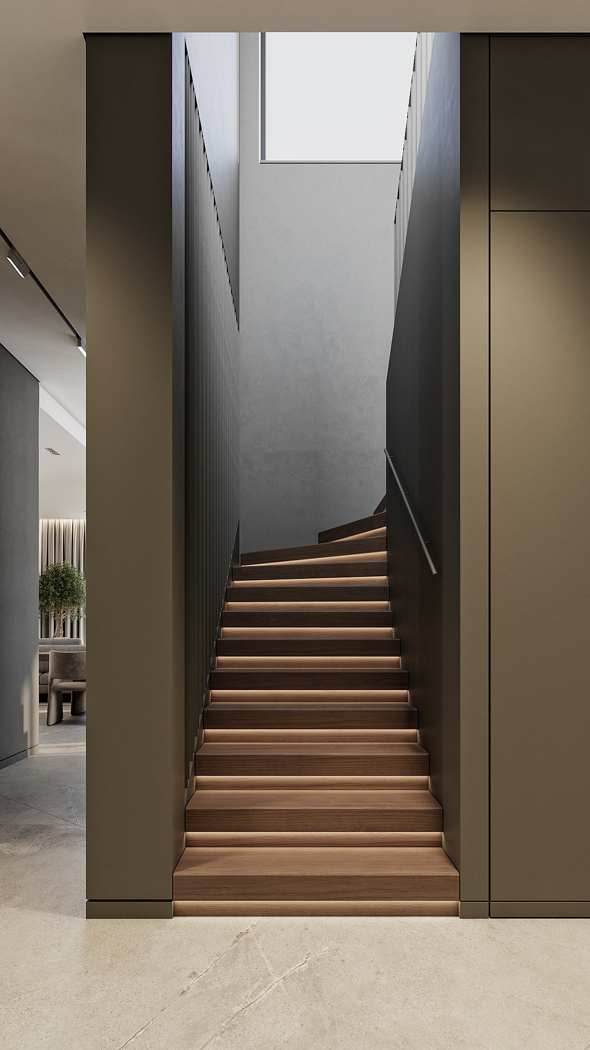 — Одним из ключевых решений для данного проекта стала кольцевая система передвижения. В центре кольца — лестница на второй этаж, заключённая в куб. Конструкция лестницы-куба зонирует и при этом не перегружает пространство. Благодаря такому решению планировка проста и логична. Перейти в любую зону можно двигаясь по кругу.