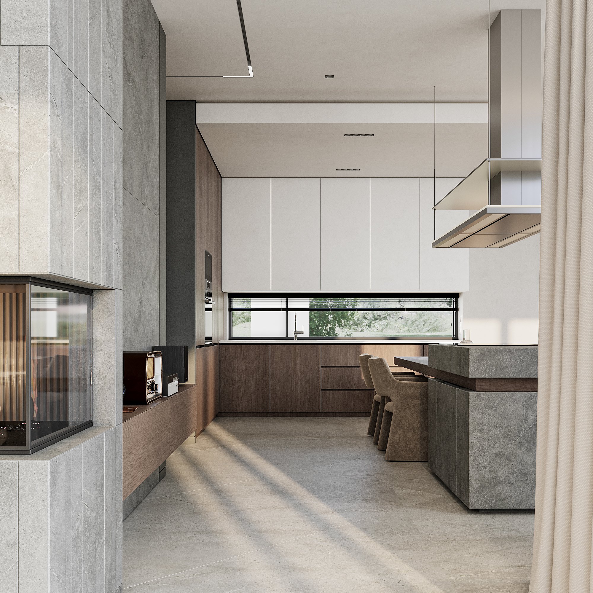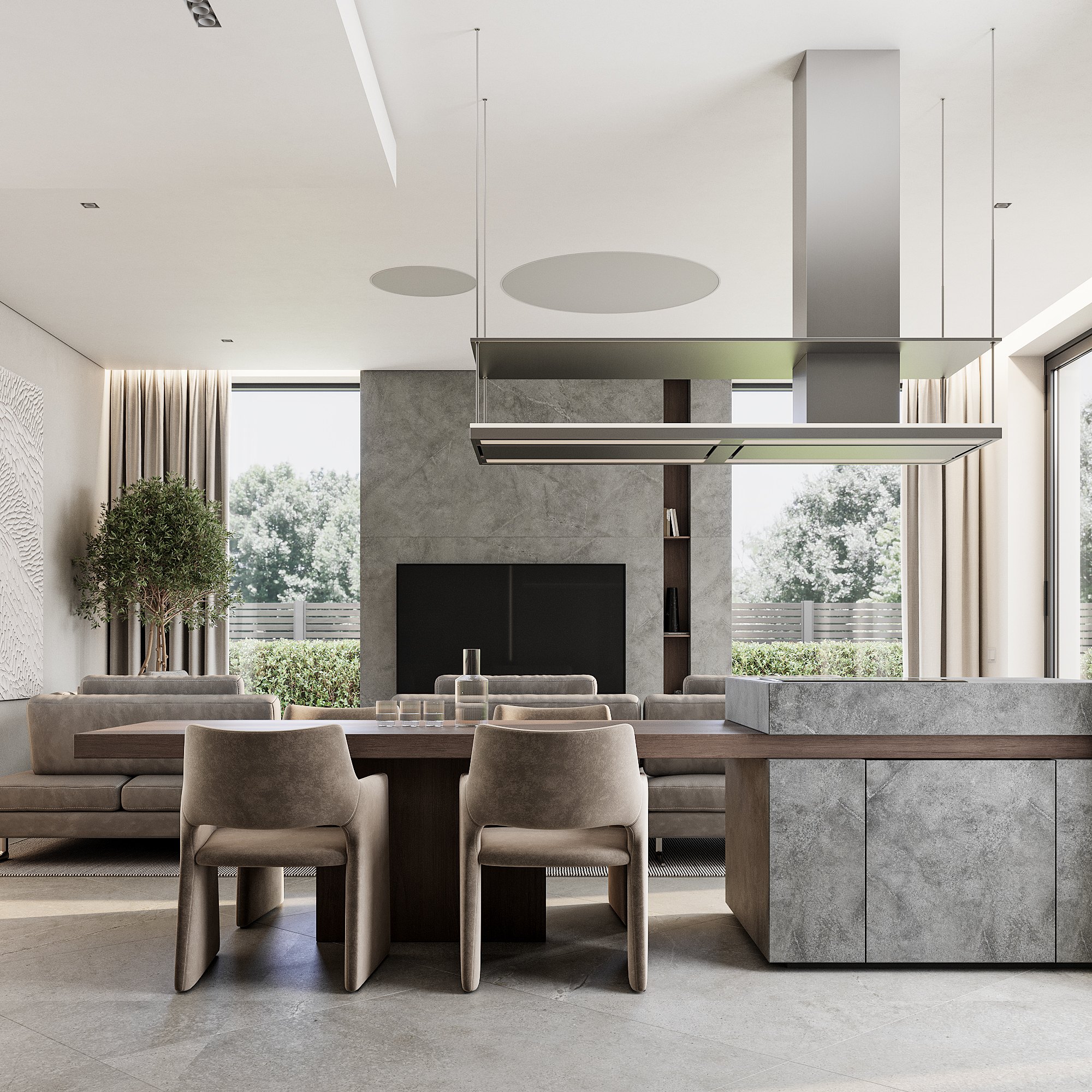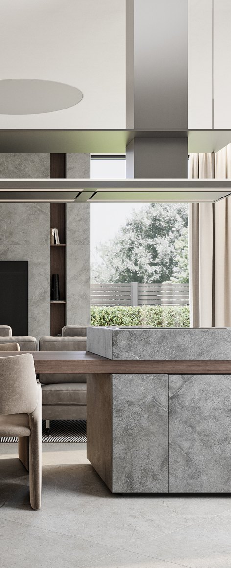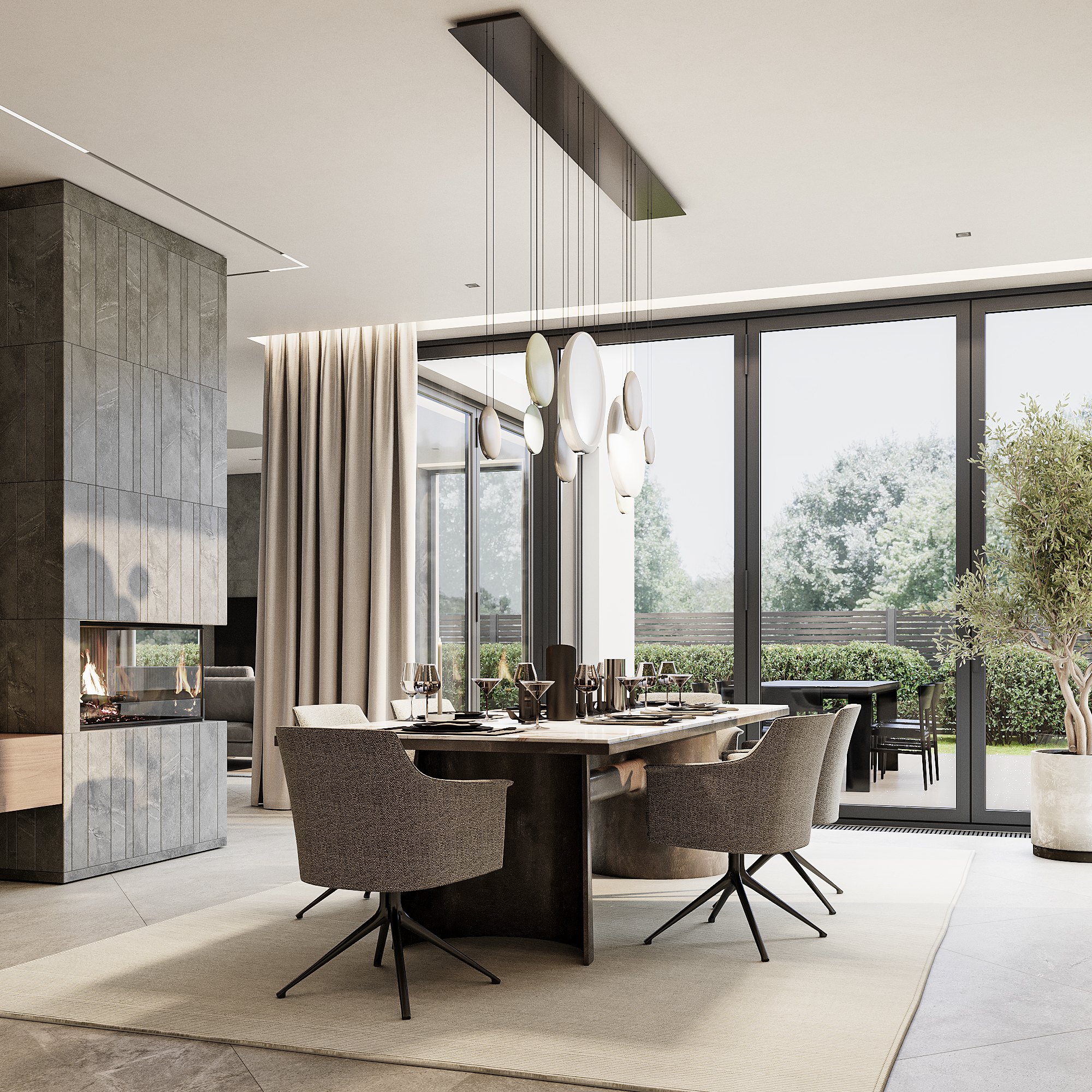 Массивную грубоватую фактуру обеденного стола уравновешивают мягкие кресла. Камин немецкой мануфактуры Brunner , просматриваемый со стороны кухни и зоны отдыха наполняет дом уютом и является местом притяжения, чтобы уединиться или провести вечер за приятными разговорами.