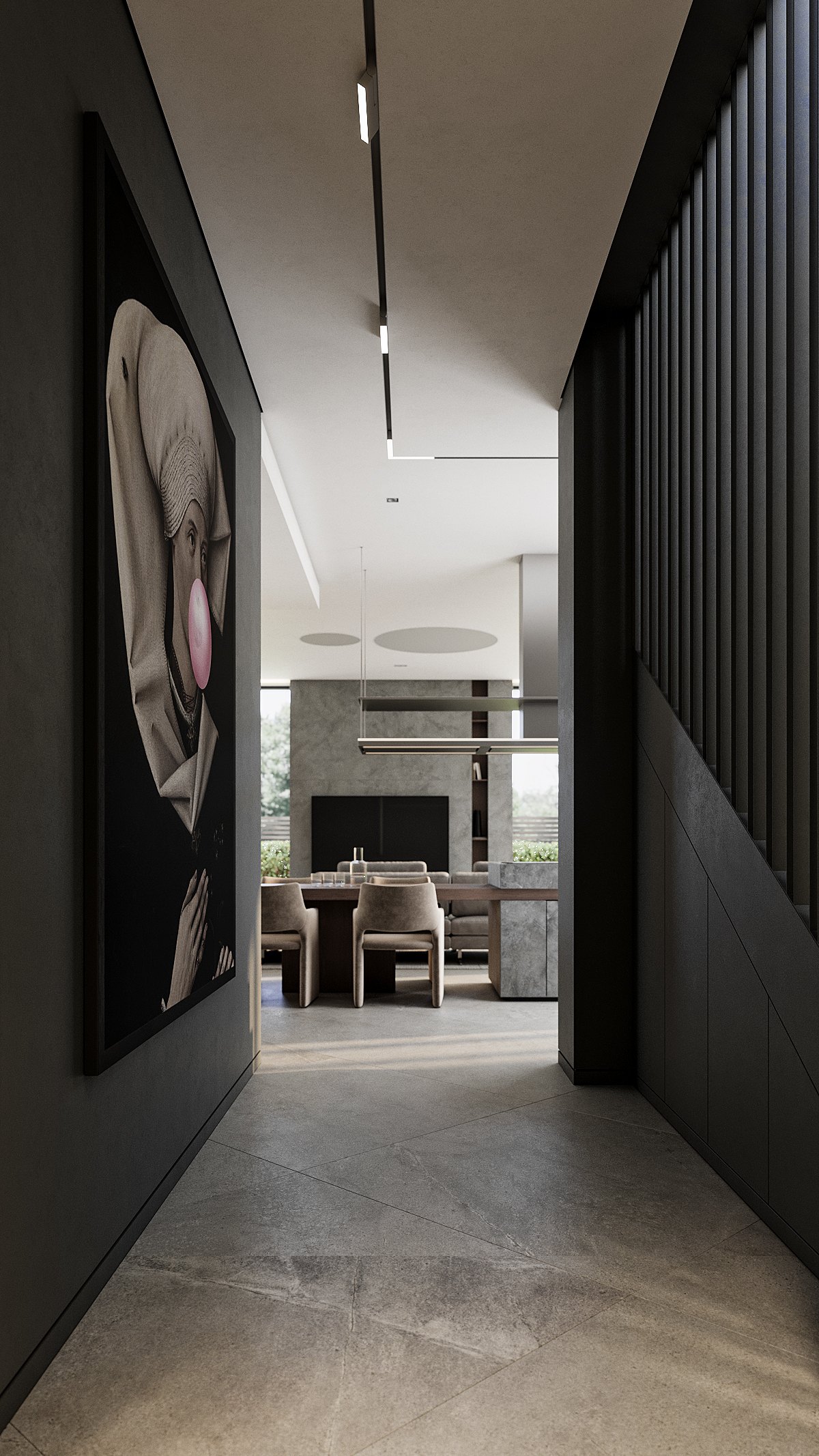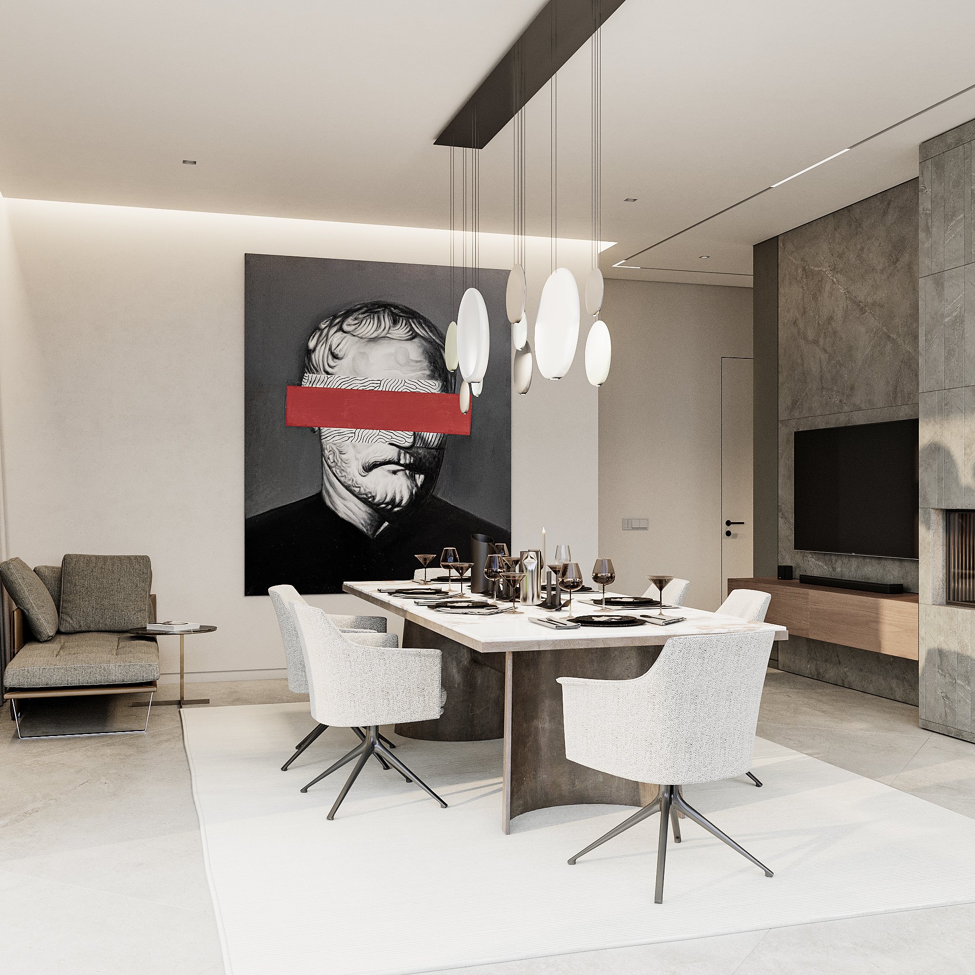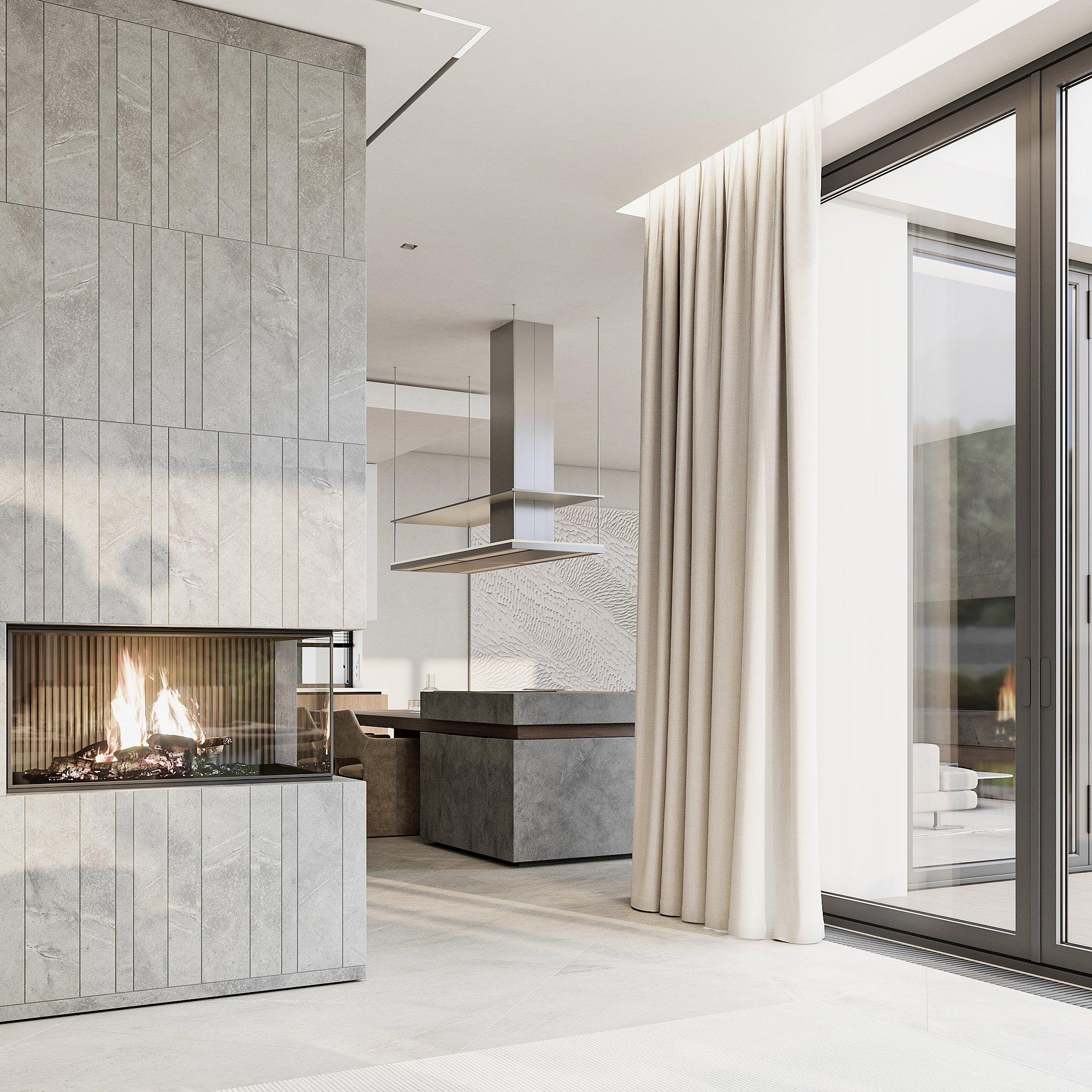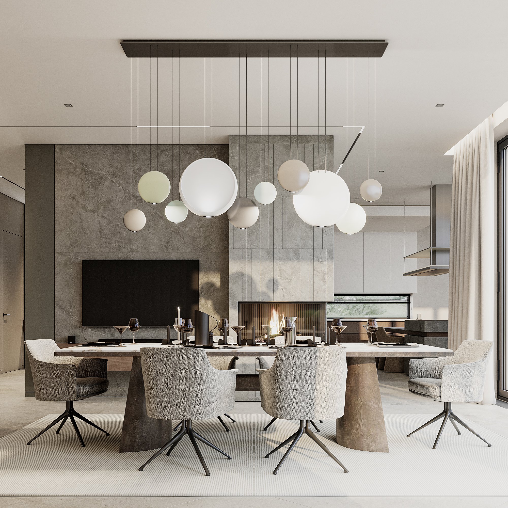 Массивную грубоватую фактуру обеденного стола уравновешивают мягкие кресла. Камин немецкой мануфактуры Brunner , просматриваемый со стороны кухни и зоны отдыха наполняет дом уютом и является местом притяжения, чтобы уединиться или провести вечер за приятными разговорами.