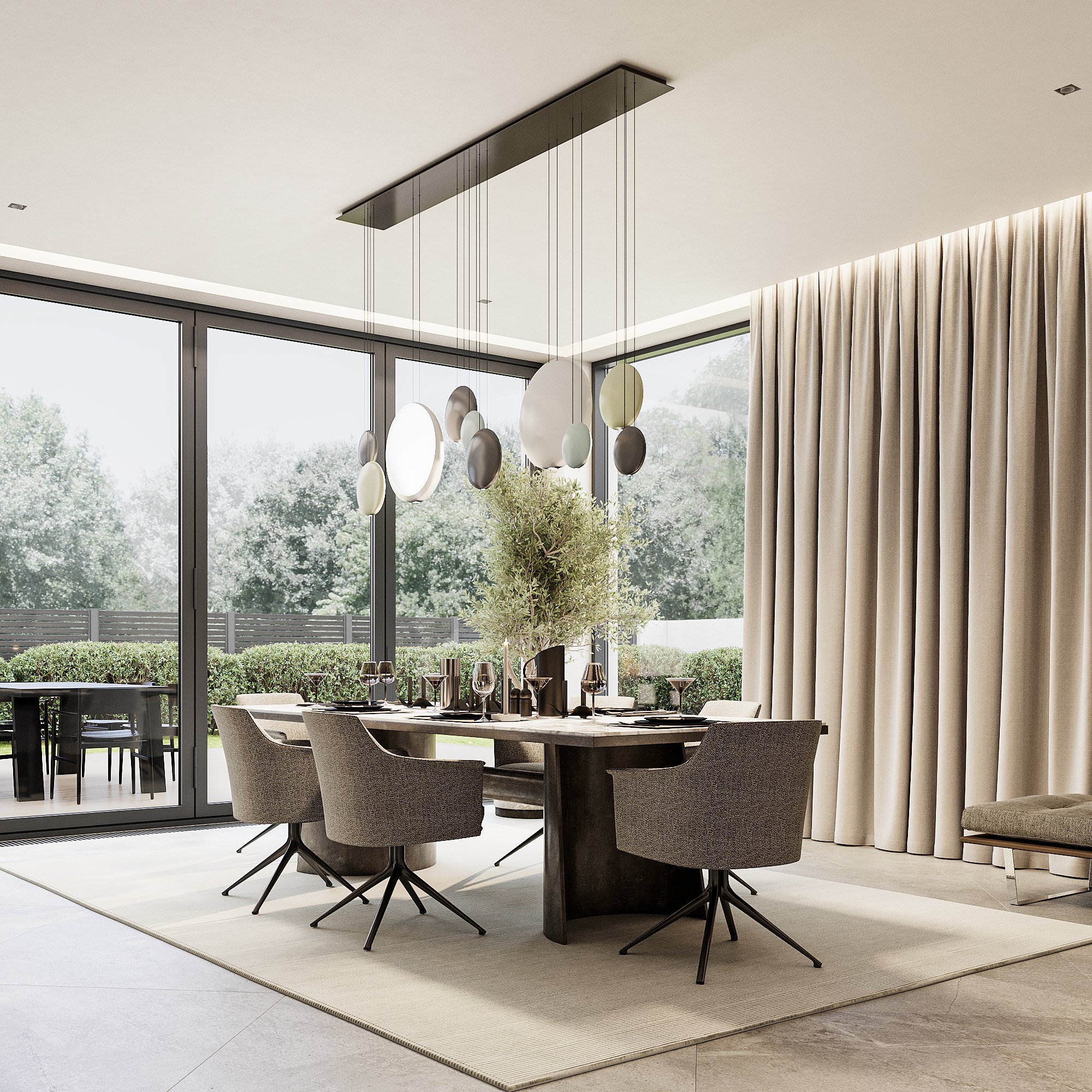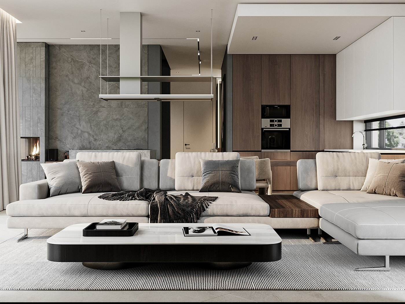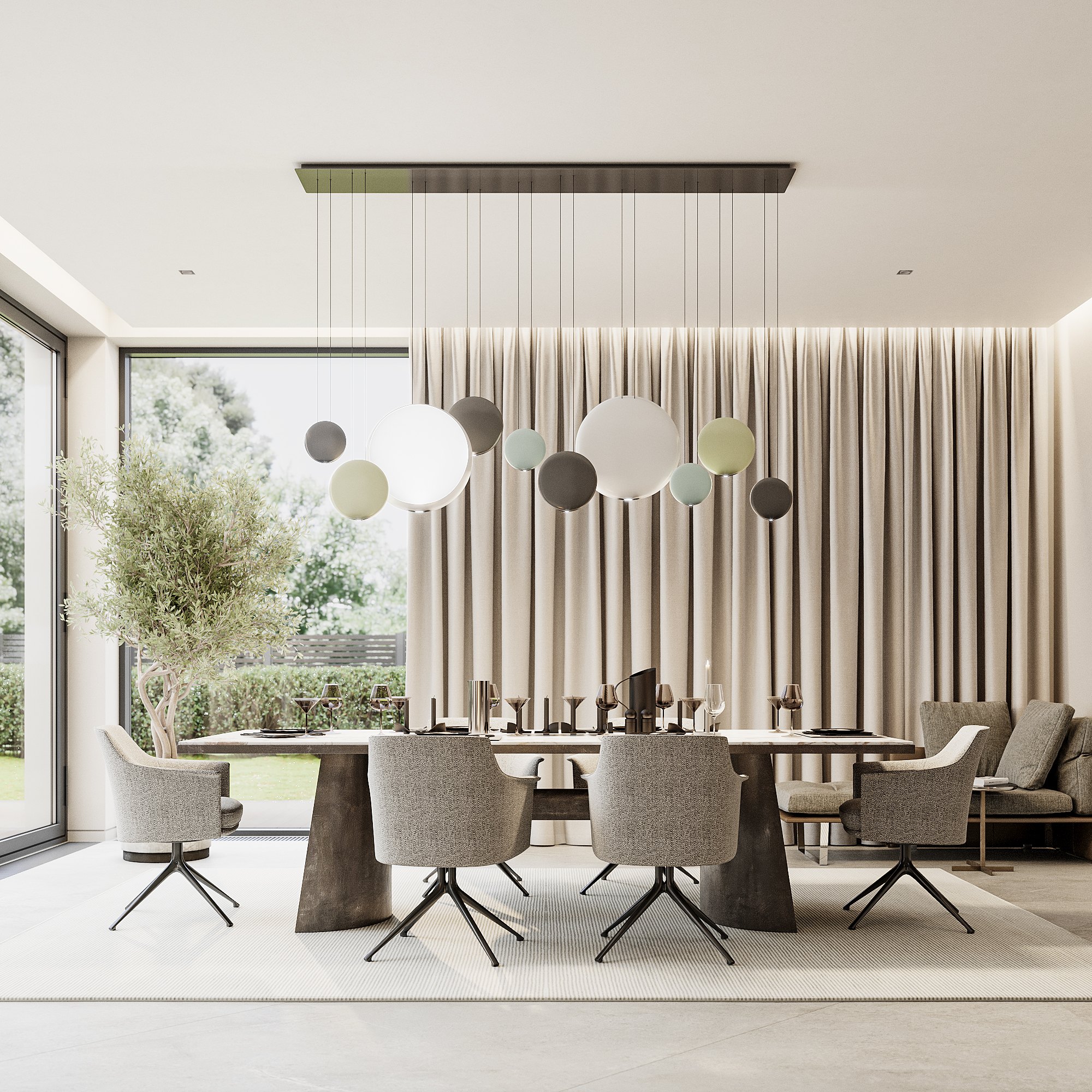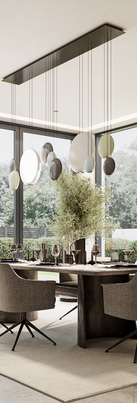 Массивную грубоватую фактуру обеденного стола уравновешивают мягкие кресла. Камин немецкой мануфактуры Brunner , просматриваемый со стороны кухни и зоны отдыха наполняет дом уютом и является местом притяжения, чтобы уединиться или провести вечер за приятными разговорами.