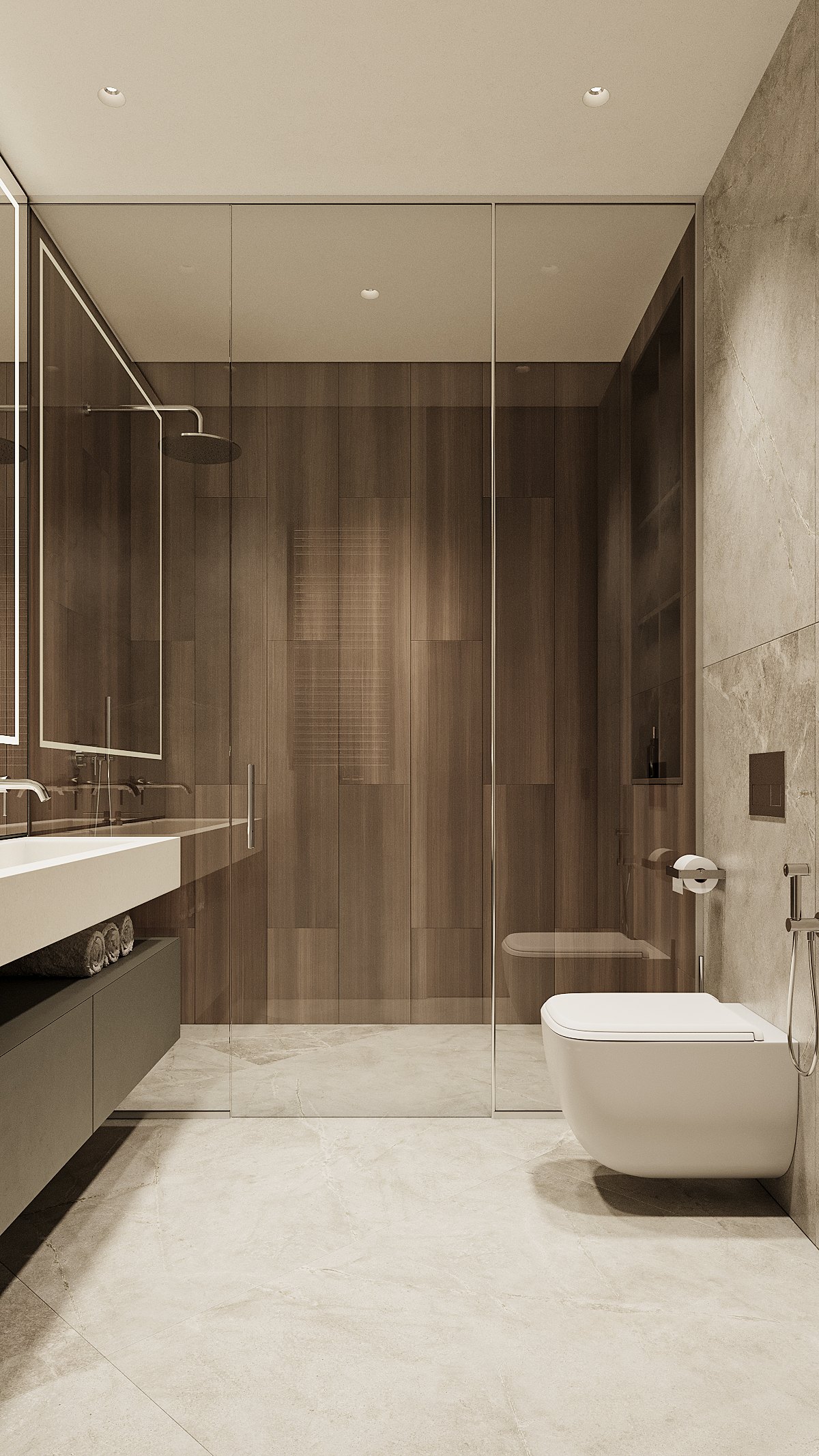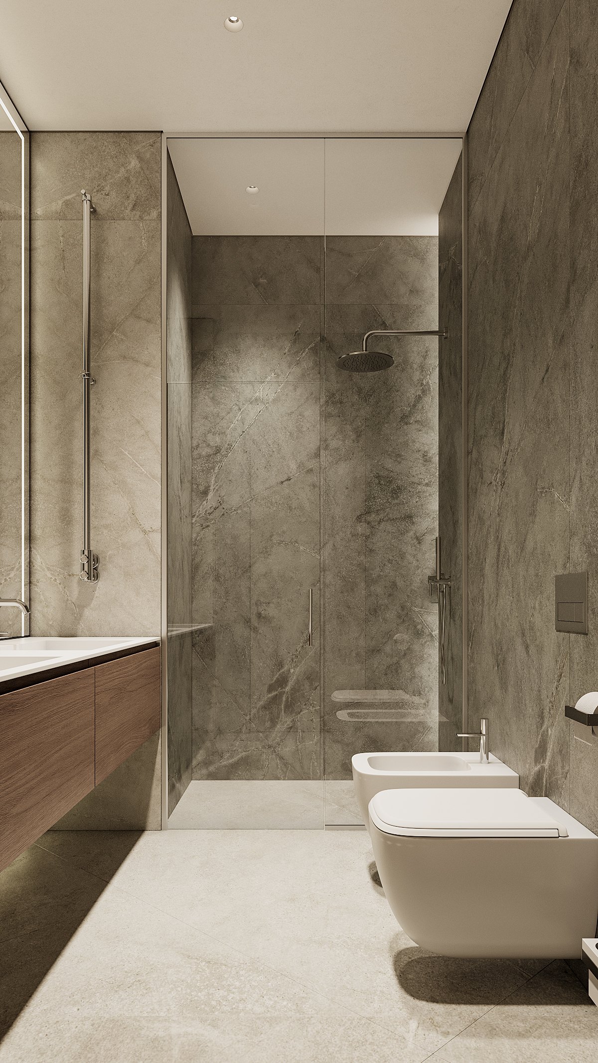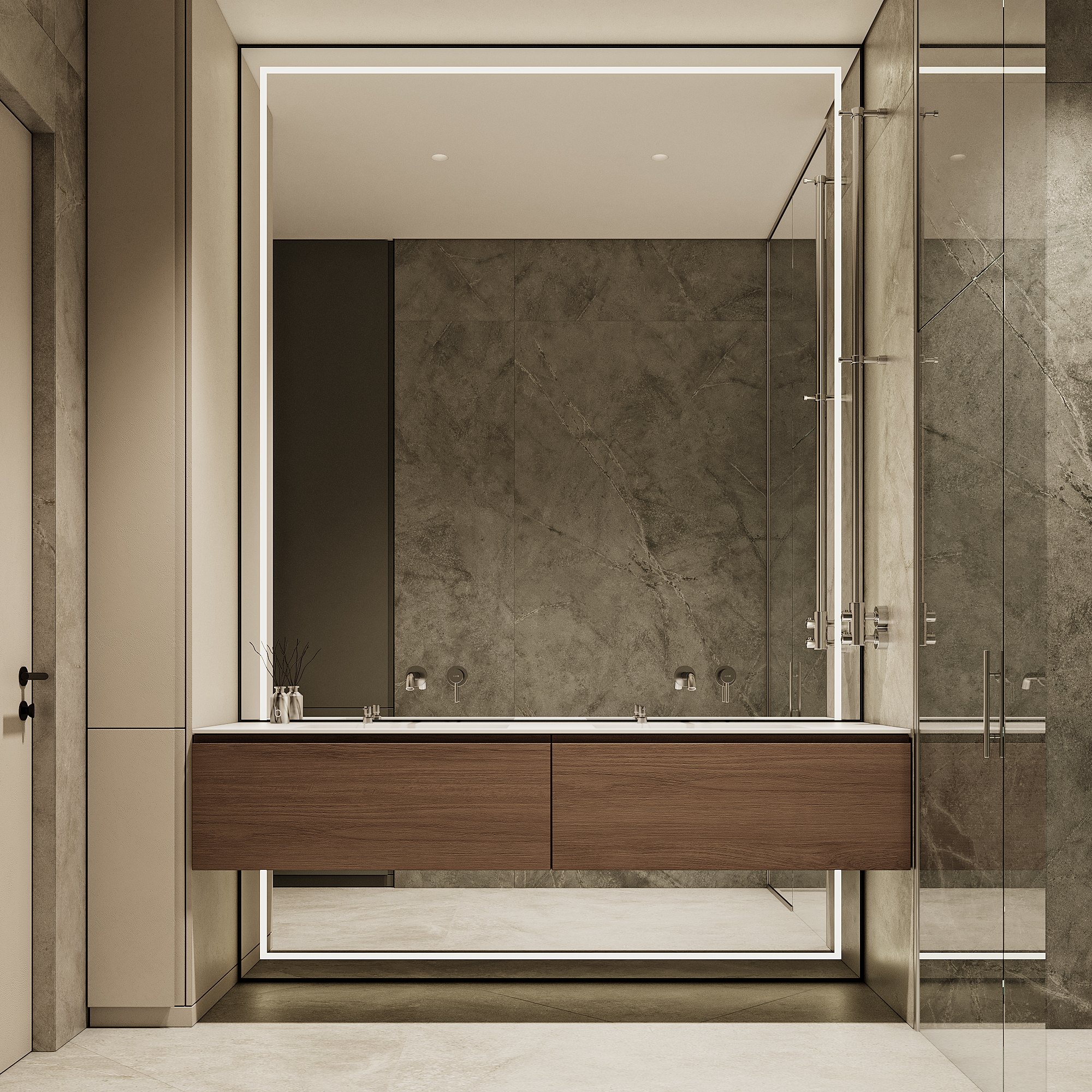 К спальне примыкает большой просторный санузел. Отделка стен выполнена керамогранитом. Дополнительный объем пространству создаёт зеркало, расположенное во всю стену с подсветкой по периметру.