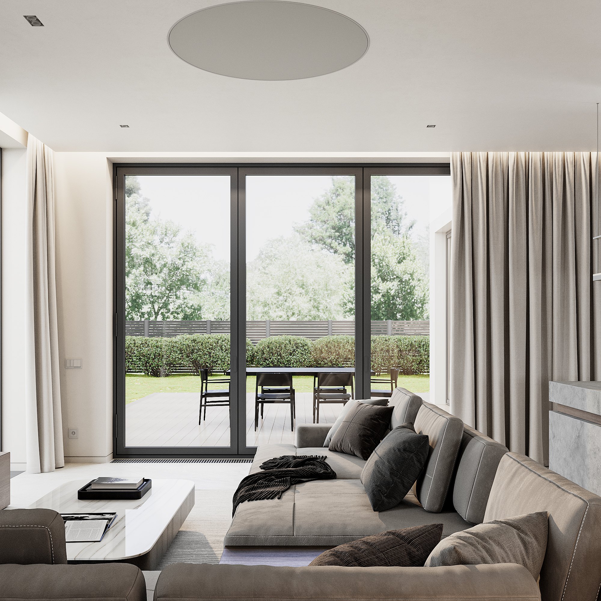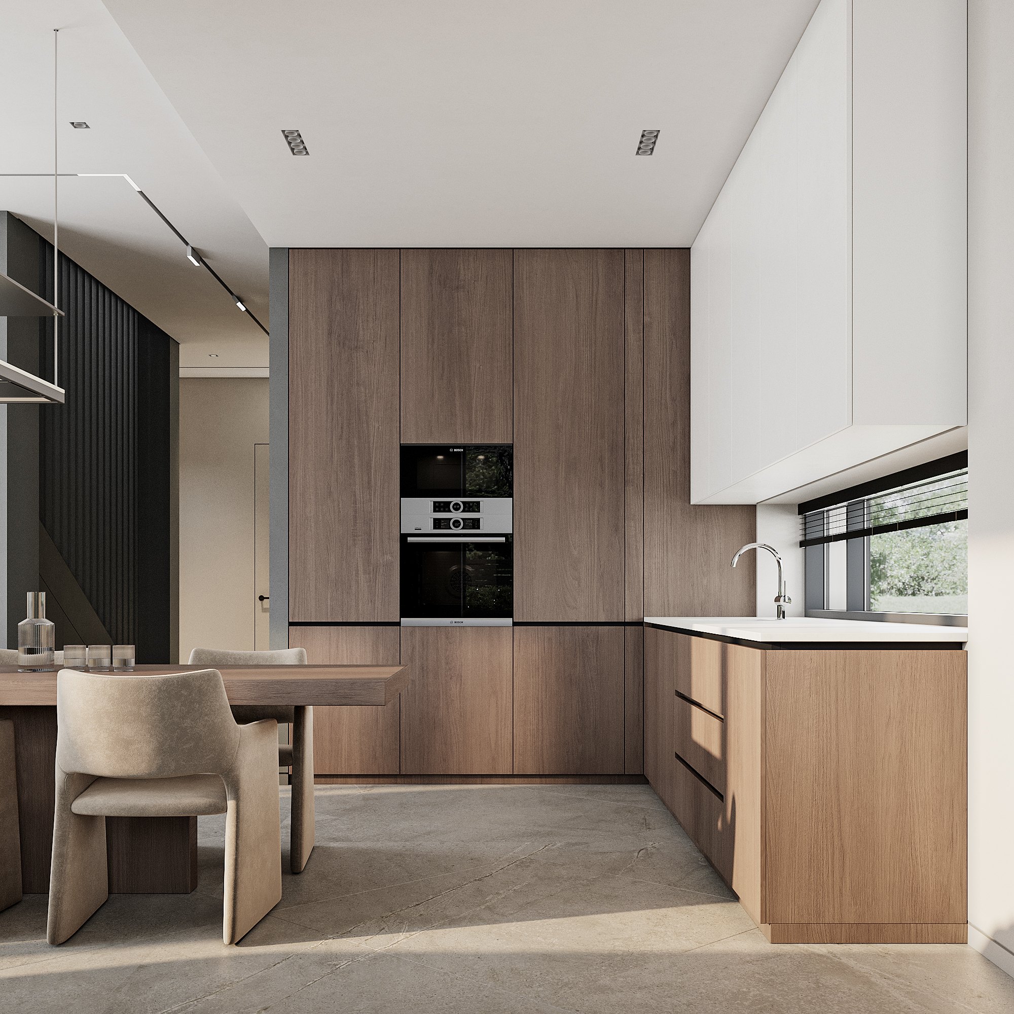 Первый этаж дома представляет собой общее безтупиковое пространство, из которого предусмотрено несколько выходов на террасу и зону для барбекю. Закарнизные подсветки, панорамное остекление, светлые натуральные тона отделки визуально расширяют помещение и создают ощущение полного погружения в природу.