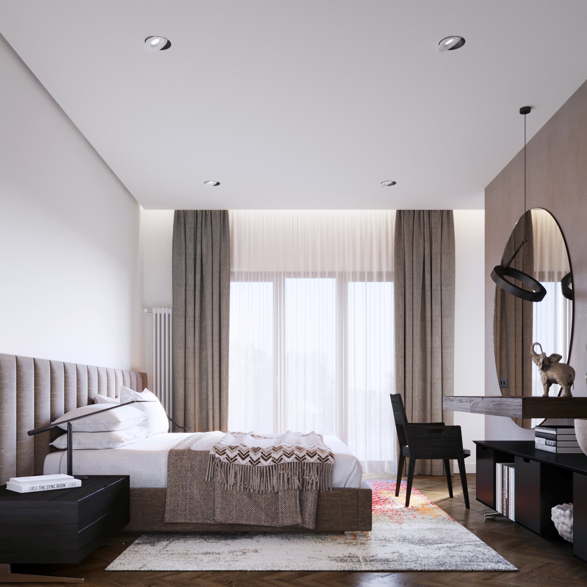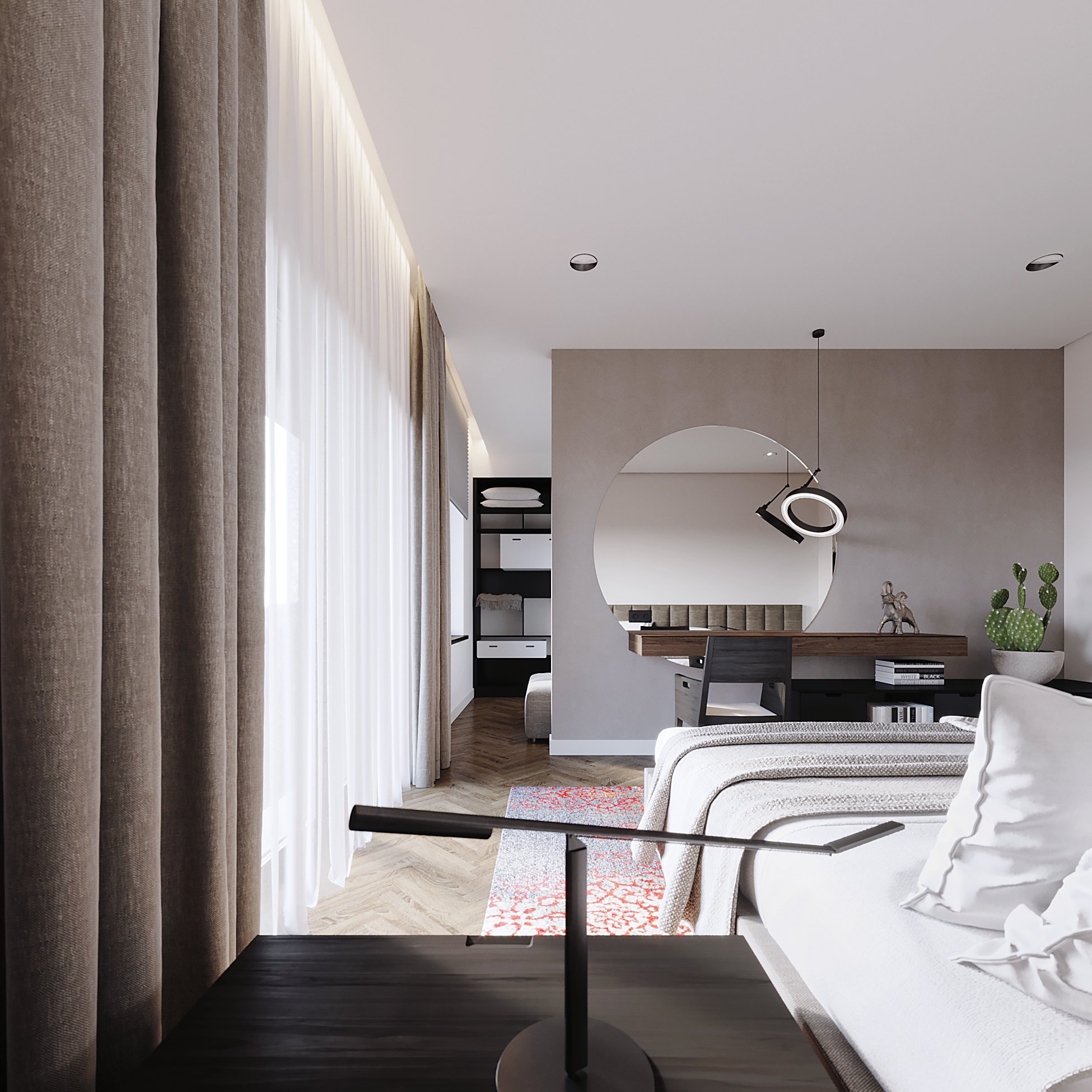Немалая площадь, отведенная под спальню, позволила архитектору организовать в комнате собственную гардеробную. Таким образом нам удалось сделать помещение более приватным и автономным.