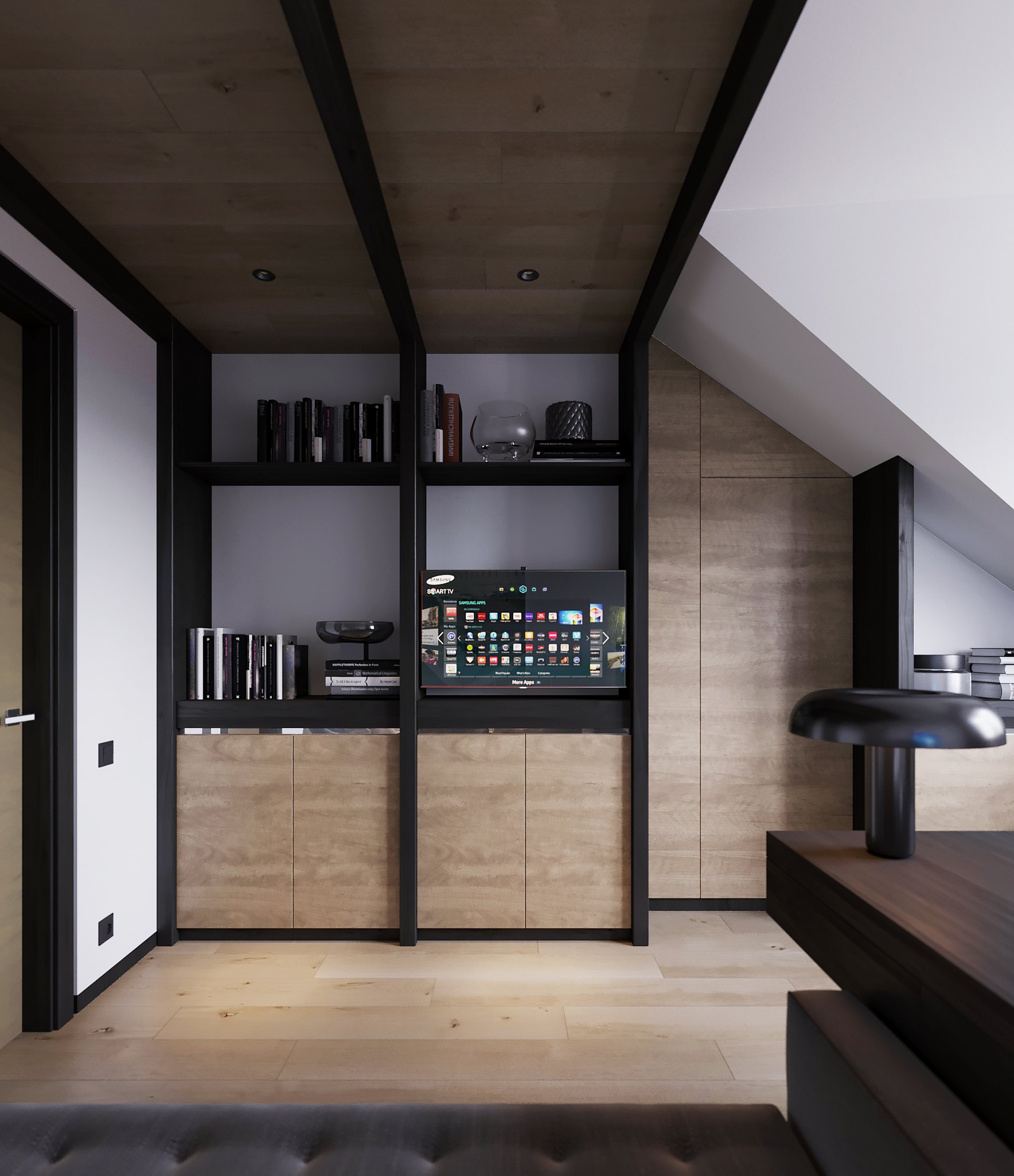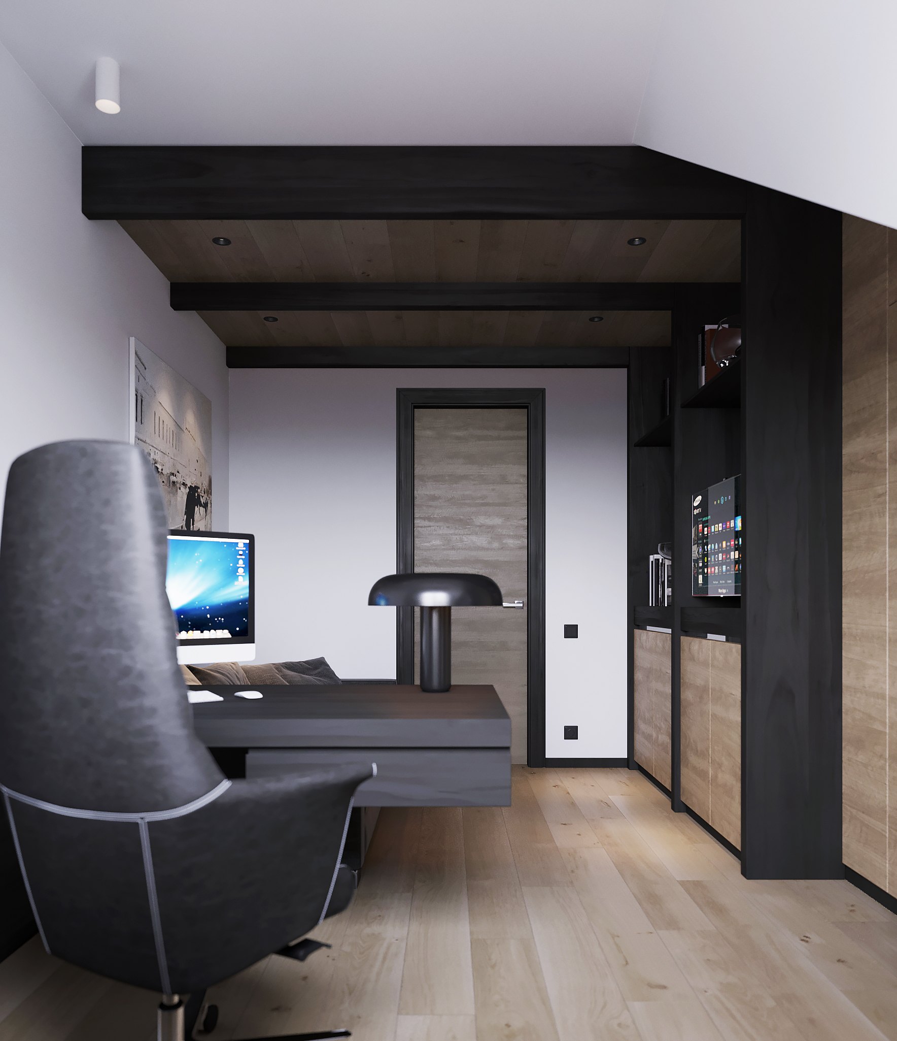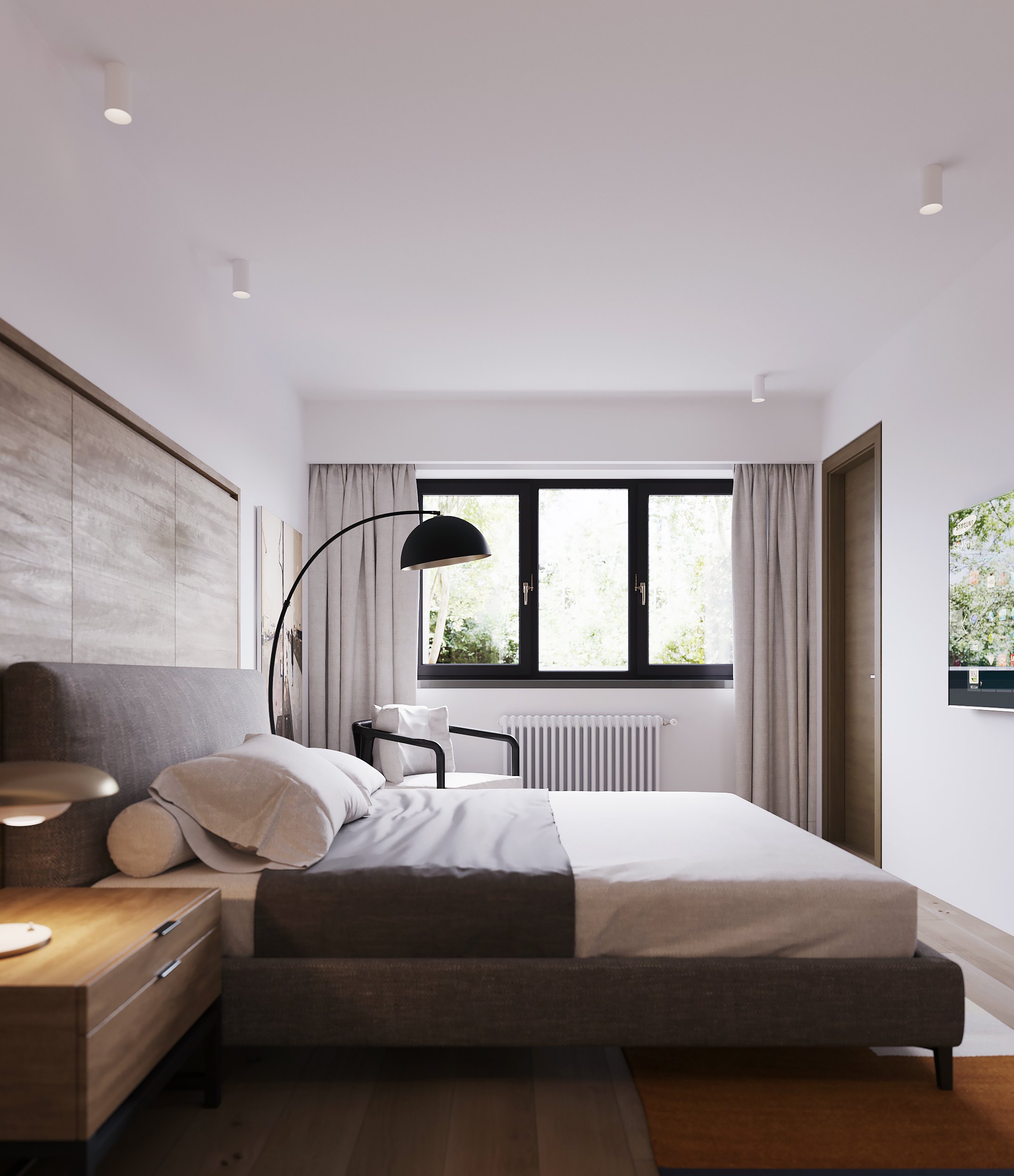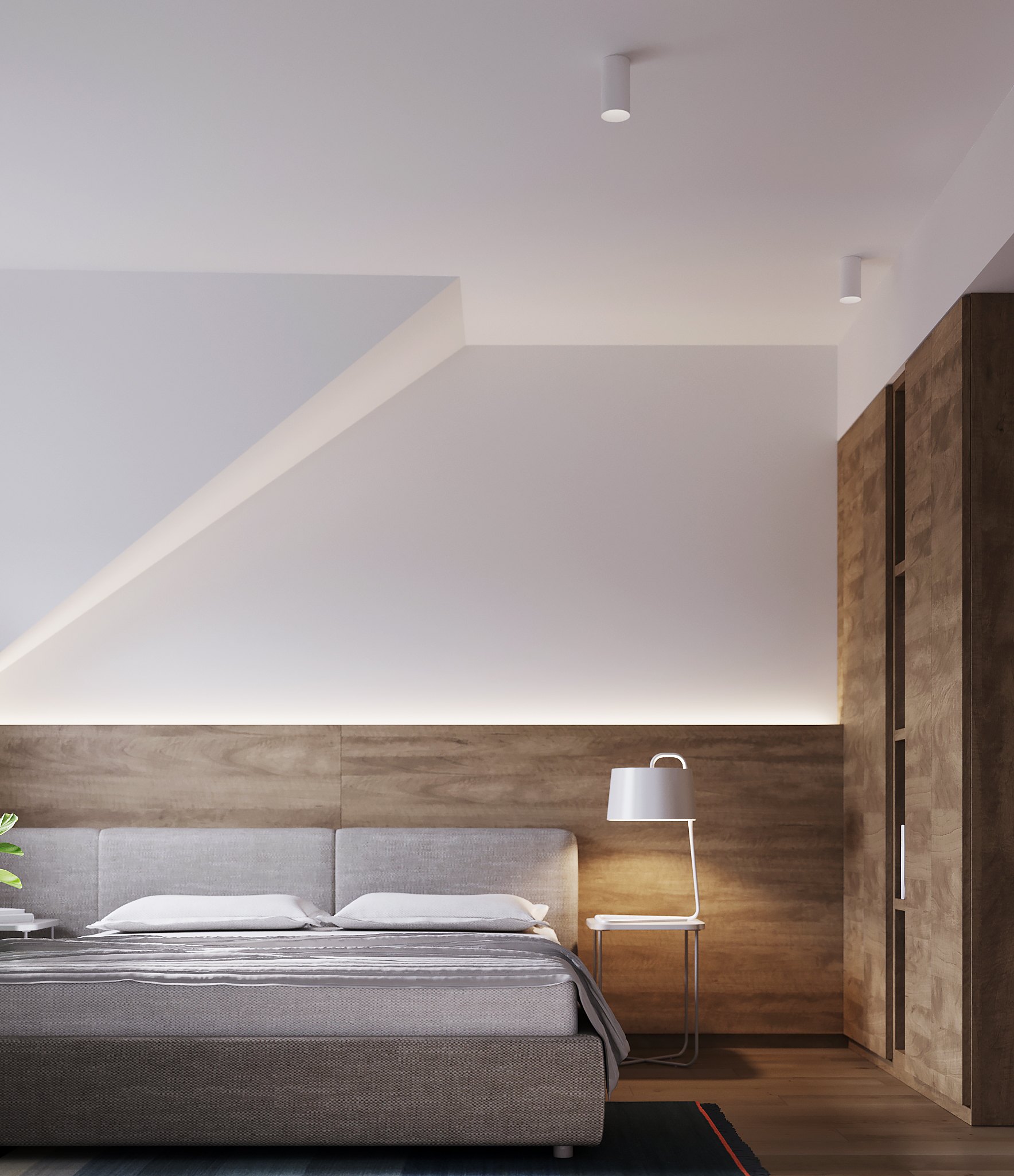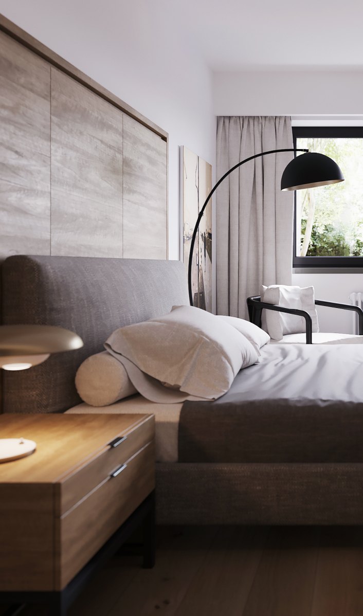 В отделке гостевой спальни использовали в основном натуральное дерево — из него по эскизам автора проекта создадут как панели для стены за изголовьем кровати, так и фасады систем хранения. Дополнят интерьер высокие двери до потолка со шпонированным полотном в тон.