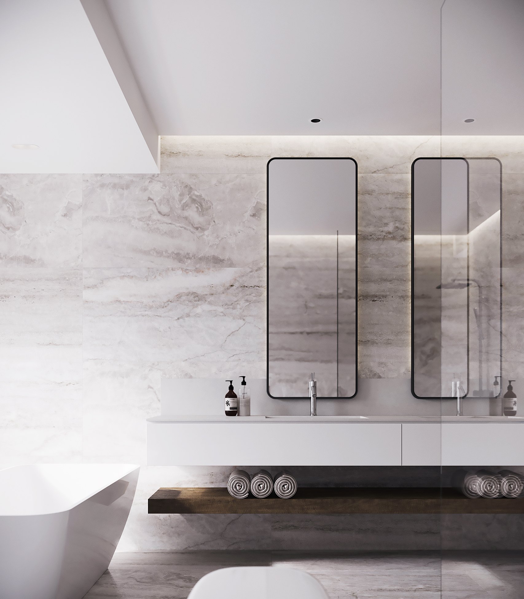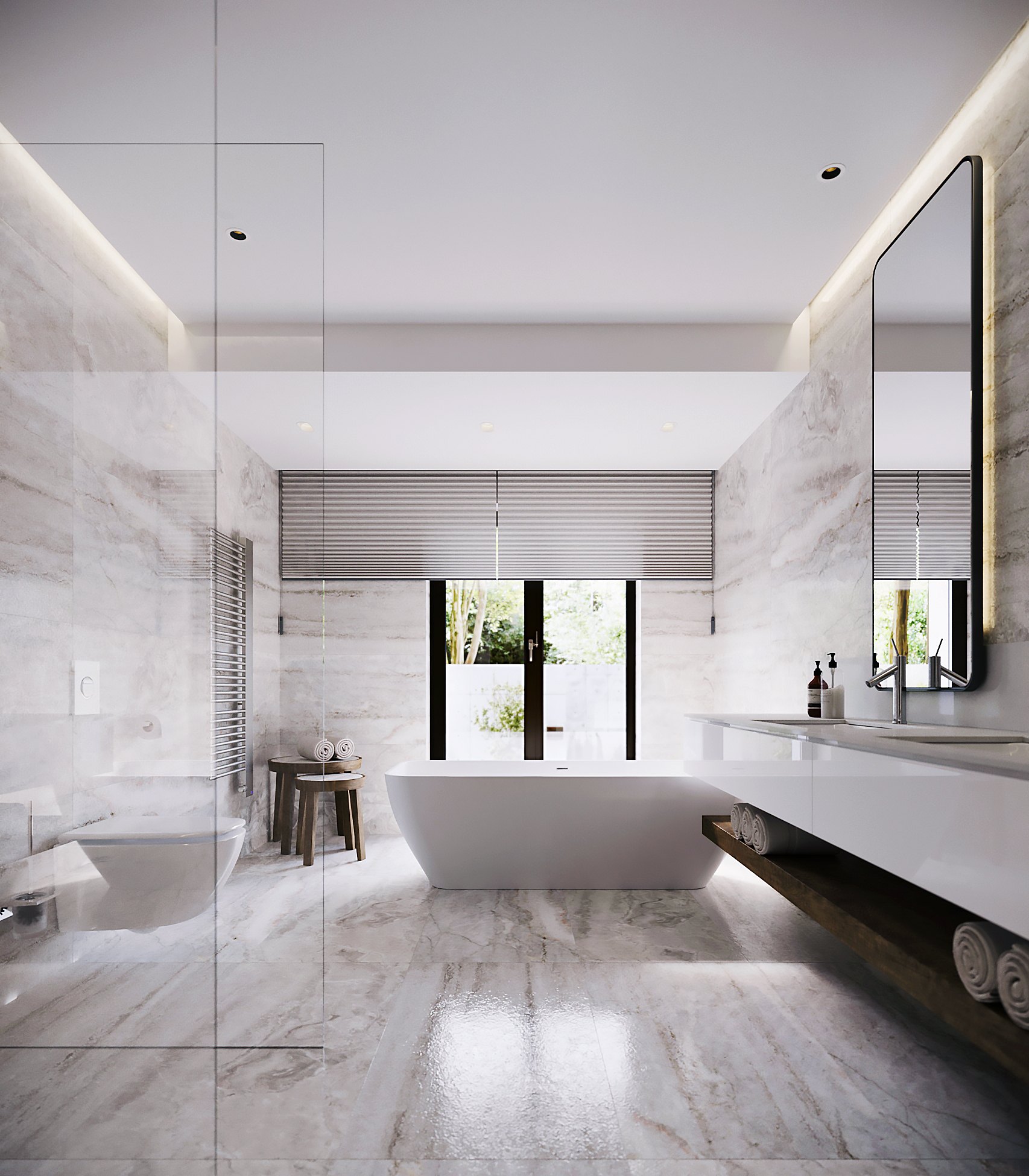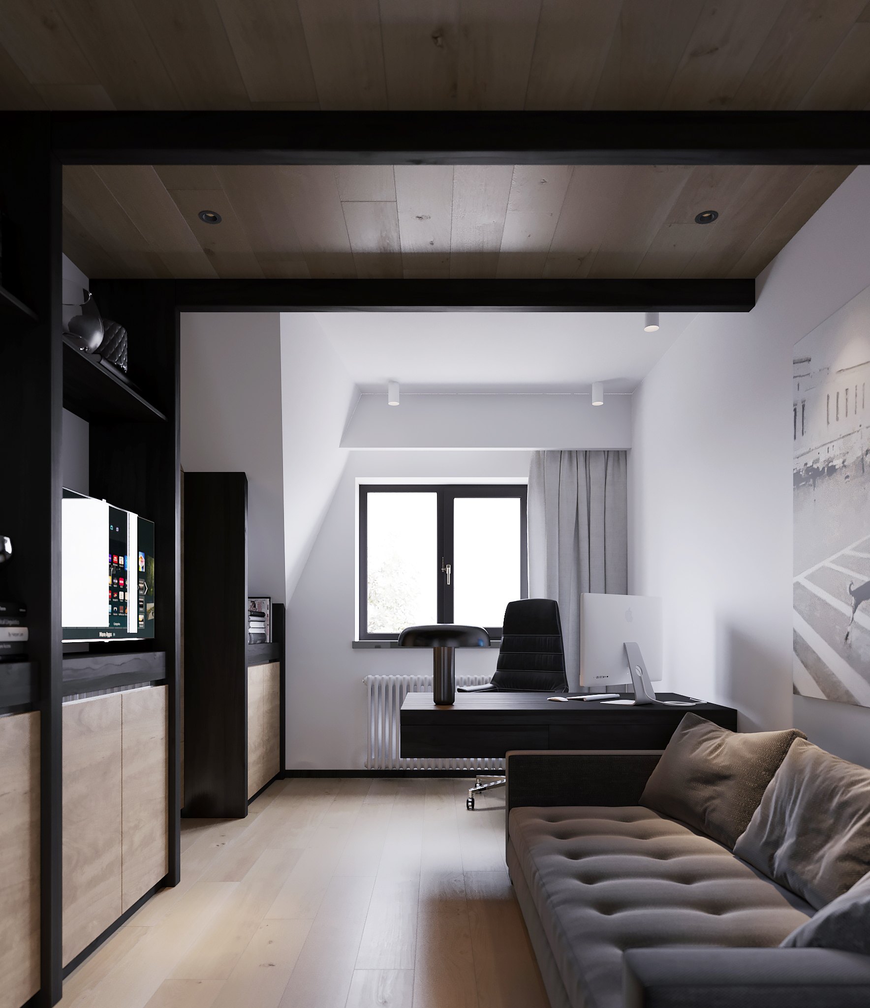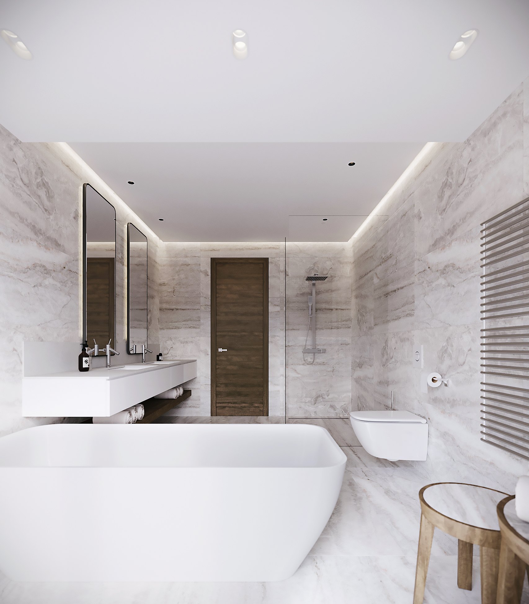 В отделке гостевой спальни использовали в основном натуральное дерево — из него по эскизам автора проекта создадут как панели для стены за изголовьем кровати, так и фасады систем хранения. Дополнят интерьер высокие двери до потолка со шпонированным полотном в тон.