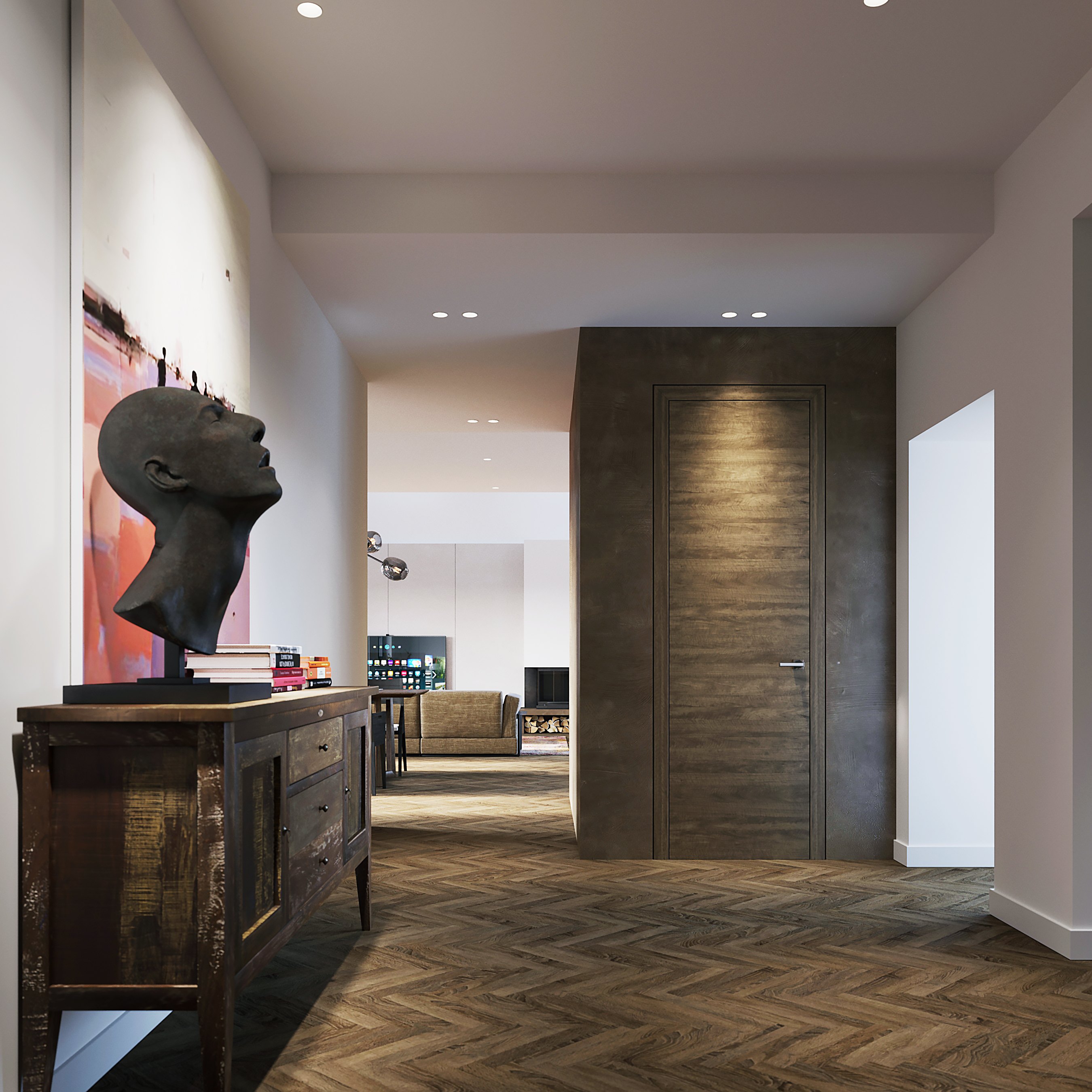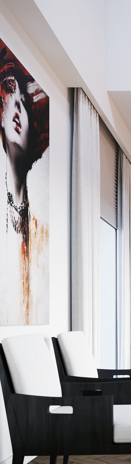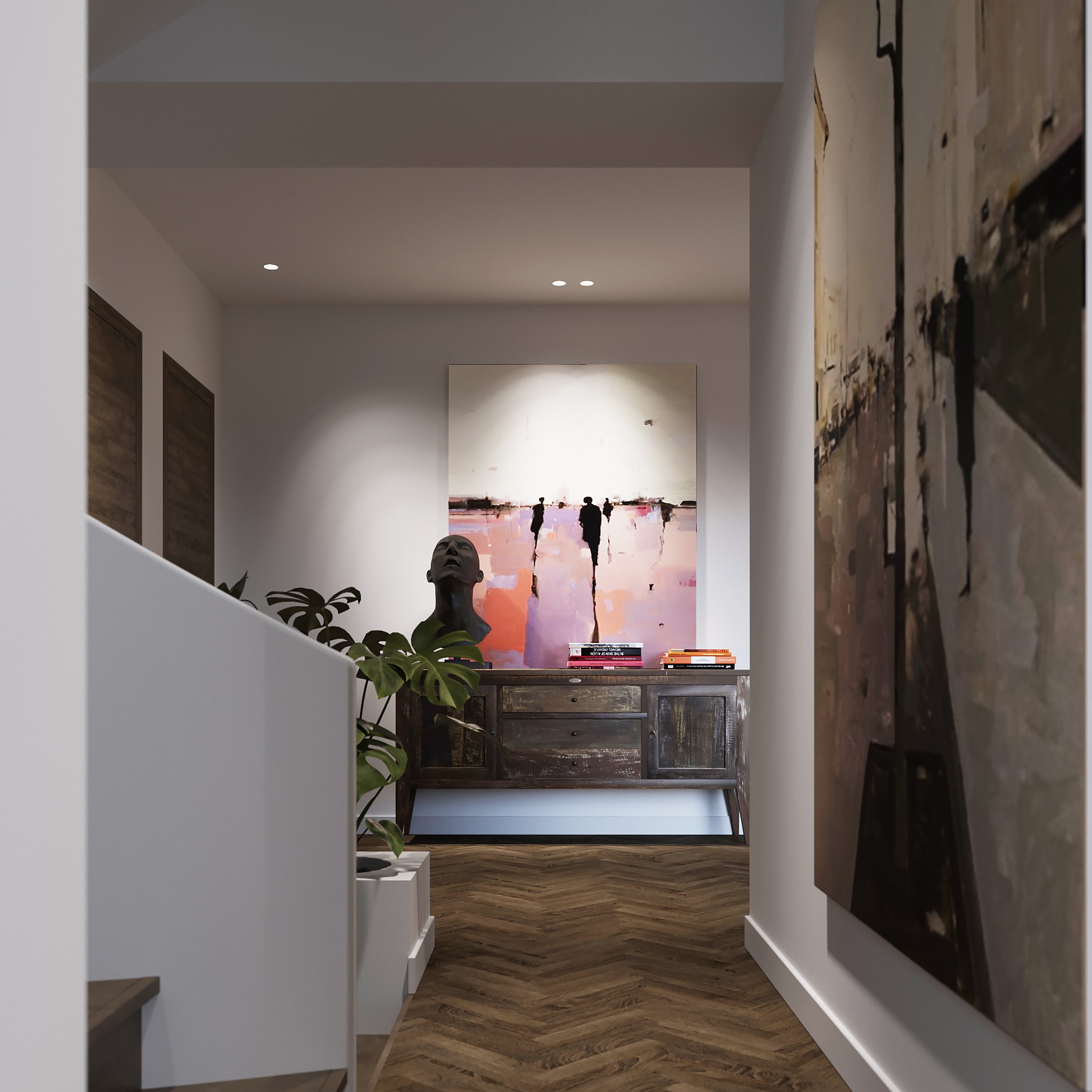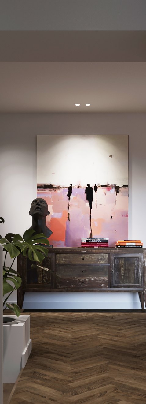 Общий фон холла нейтральный. Особое настроение здесь задает композиция из предметов современного искусства, благодаря которой интерьер становится по-настоящему уникальным.