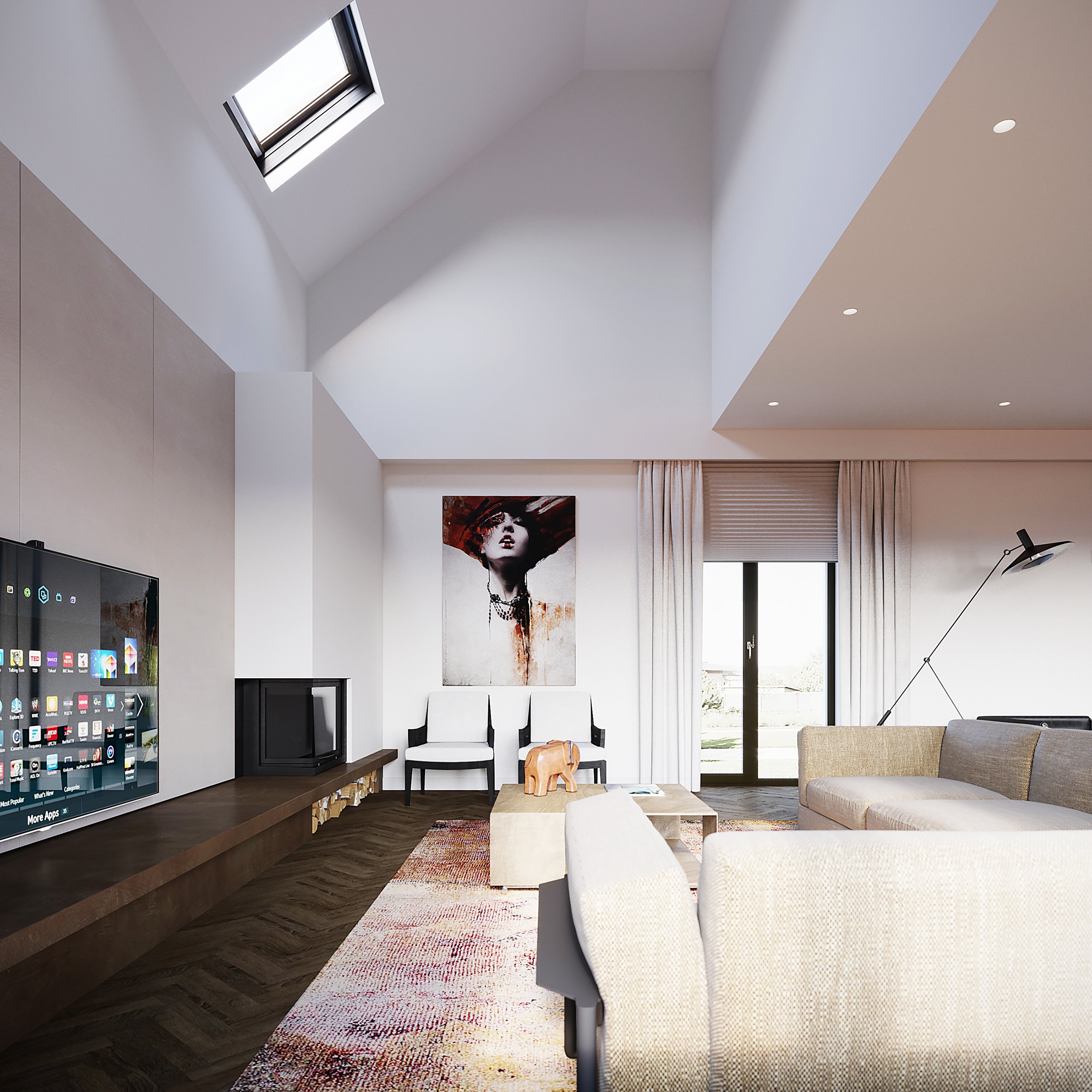Так как изначальный проект дома подвергся полной реконструкции, простора для творчества в плане построения пространства у архитектора было много. Так возникла идея немного поломать геометрию и объем помещения при помощи разноуровневого потолка. В итоге это и стало «фишкой» всего дизайн-проекта интерьера дома.