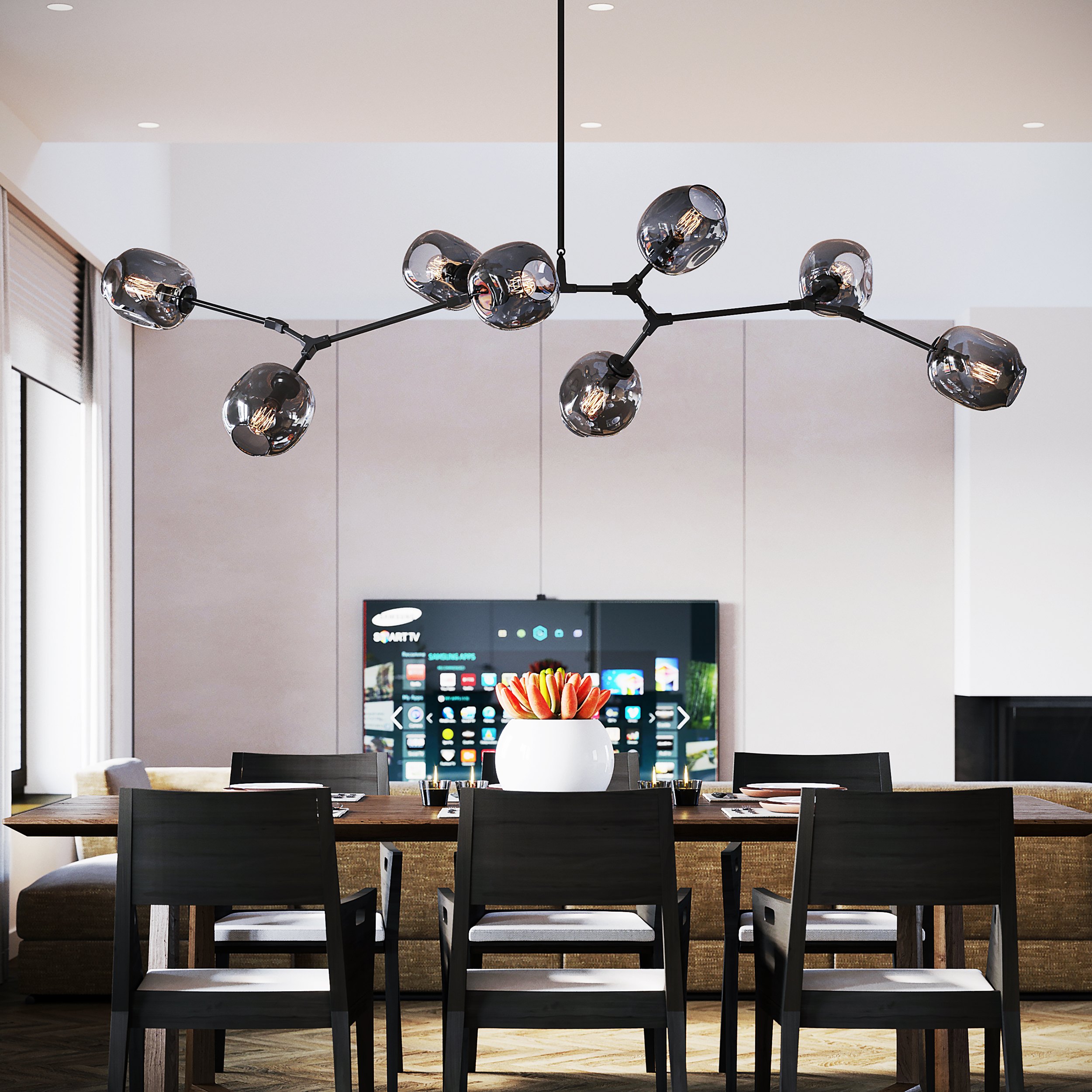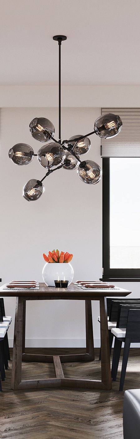 — Очень важно расположить свет над столом на правильной высоте: в помещениях с низкими и стандартными потолками размещайте светильники на расстоянии 0,75 м над столешницей либо 1,5 м от пола; в помещениях с высокими потолками – на уровне 0,8 м над столом либо 1,6 м от пола.