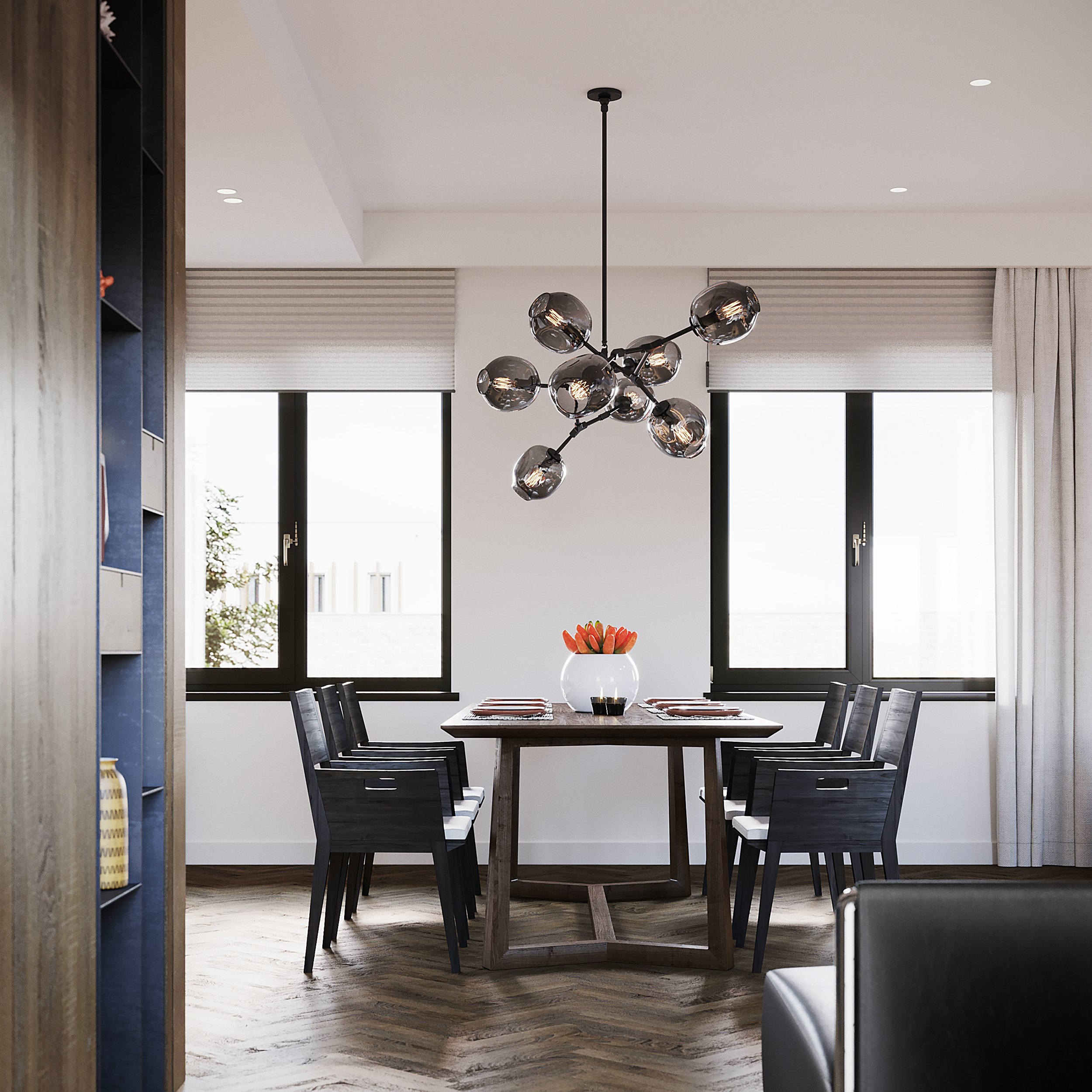 Гостевая зона плавно перетекает в столовую с большим обеденным столом. В данном случае пространство зонируется исключительно при помощи геометрии потолка.